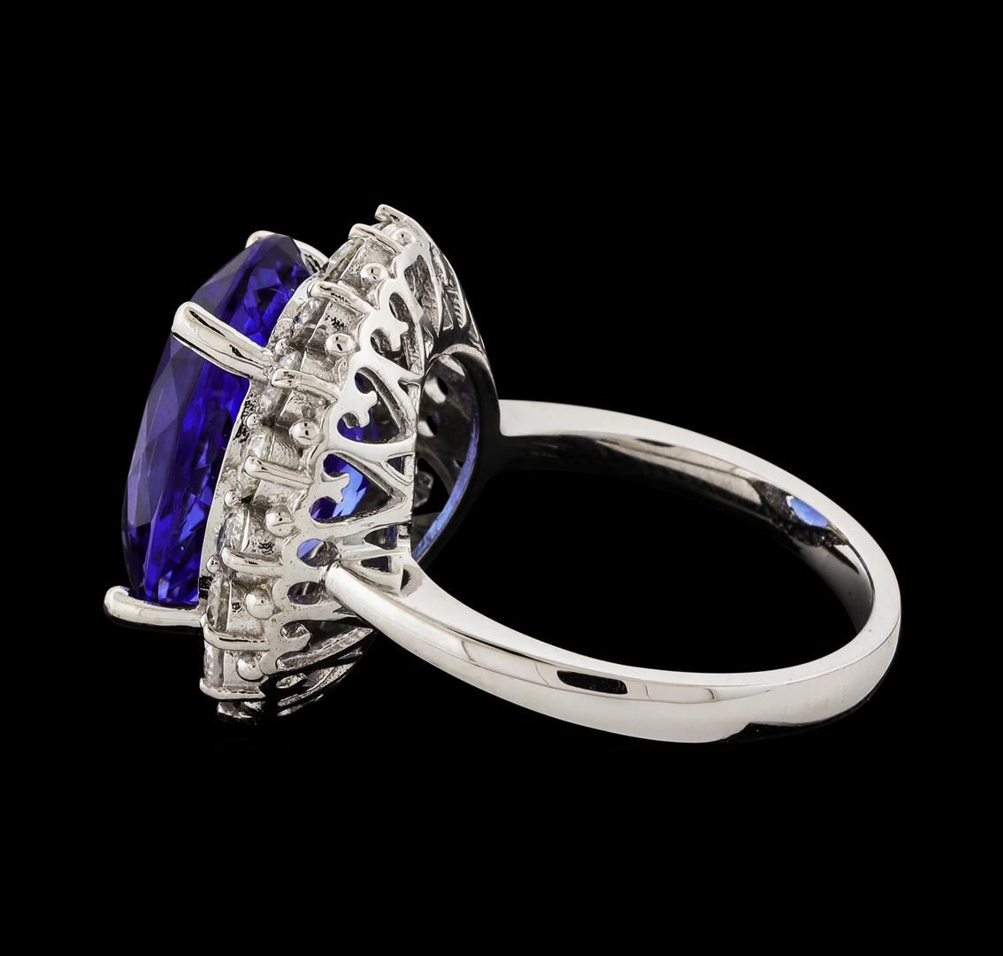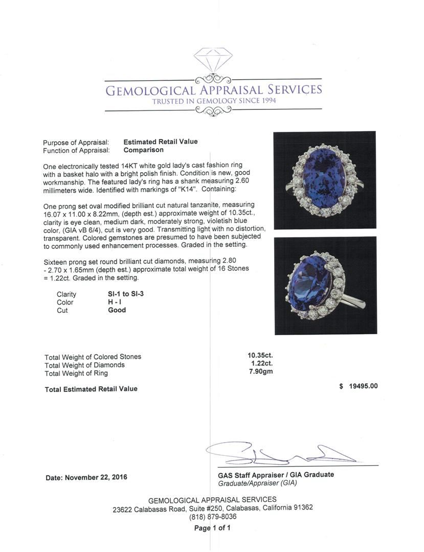 One electronically tested 14KT white gold lady's cast fashion ring with a basket halo with a bright polish finish. The featured lady's ring has a shank measuring 2.60 millimeters wide. Identified with markings of 'K14'. Condition is new, good workmanship. Containing: One prong set oval modified brilliant cut natural tanzanite, measuring 16.07 x 11.00 x 8.22mm, (depth est.) approximate weight of 10.35ct., clarity is eye clean, medium dark, moderately strong, violetish blue color, (GIA vB 6/4), cut is very good. Transmitting light with no distortion, transparent. Colored gemstones are presumed to have been subjected to commonly used enhancement processes. Graded in the setting. Sixteen prong set round brilliant cut diamonds, measuring 2.80 - 2.70 x 1.65mm (depth est.) approximate total weight of 16 Stones = 1.22ct. Graded in the setting. Clarity SI-1 to SI-3. Color: H - I Cut Good. Total Weight of Colored Stones 10.35ct.. Total Weight of Diamonds 1.22ct.. Total Weight of Ring 7.90gm. GAS Appraised at $19,495.00.