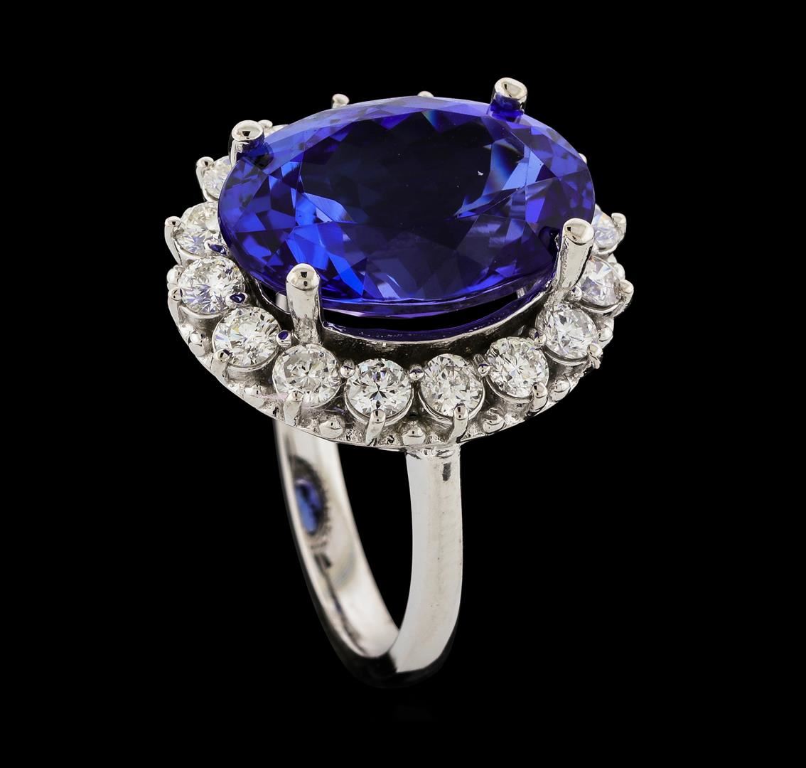 One electronically tested 14KT white gold lady's cast fashion ring with a basket halo with a bright polish finish. The featured lady's ring has a shank measuring 2.60 millimeters wide. Identified with markings of 'K14'. Condition is new, good workmanship. Containing: One prong set oval modified brilliant cut natural tanzanite, measuring 16.07 x 11.00 x 8.22mm, (depth est.) approximate weight of 10.35ct., clarity is eye clean, medium dark, moderately strong, violetish blue color, (GIA vB 6/4), cut is very good. Transmitting light with no distortion, transparent. Colored gemstones are presumed to have been subjected to commonly used enhancement processes. Graded in the setting. Sixteen prong set round brilliant cut diamonds, measuring 2.80 - 2.70 x 1.65mm (depth est.) approximate total weight of 16 Stones = 1.22ct. Graded in the setting. Clarity SI-1 to SI-3. Color: H - I Cut Good. Total Weight of Colored Stones 10.35ct.. Total Weight of Diamonds 1.22ct.. Total Weight of Ring 7.90gm. GAS Appraised at $19,495.00.