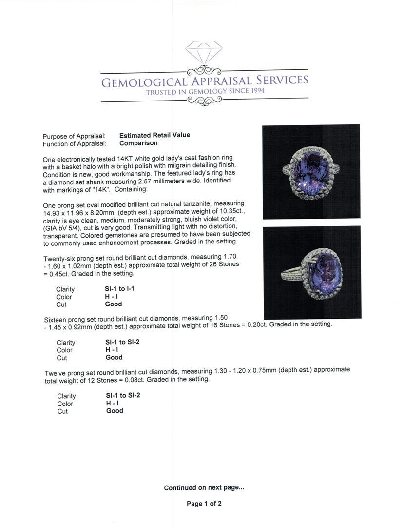 One electronically tested 14KT white gold lady's cast fashion ring with a basket halo with a bright polish with milgrain detailing finish. The featured lady's ring has a diamond set shank measuring 2.57 millimeters wide. Identified with markings of '14K'. Condition is new, good workmanship. Containing: One prong set oval modified brilliant cut natural tanzanite, measuring 14.93 x 11.96 x 8.20mm, (depth est.) approximate weight of 10.35ct., clarity is eye clean, medium, moderately strong, bluish violet color, (GIA bV 5/4), cut is very good. Transmitting light with no distortion, transparent. Colored gemstones are presumed to have been subjected to commonly used enhancement processes. Graded in the setting. Twenty-Six prong set round brilliant cut diamonds, measuring 1.70 - 1.60 x 1.02mm (depth est.) approximate total weight of 26 Stones = 0.45ct. Graded in the setting. Clarity SI-1 to I-1. Color: H - I Cut Good Sixteen prong set round brilliant cut diamonds, measuring 1.50 - 1.45 x 0.92mm (depth est.) approximate total weight of 16 Stones = 0.20ct. Graded in the setting. Clarity SI-1 to SI-2. Color: H - I Cut Good Twelve prong set round brilliant cut diamonds, measuring 1.30 - 1.20 x 0.75mm (depth est.) approximate total weight of 12 Stones = 0.08ct. Graded in the setting. Clarity SI-1 to SI-2. Color: H - I Cut Good. Total Weight of Colored Stones 10.35ct.. Total Weight of Diamonds 0.73ct.. Total Weight of Ring 9.20gm GAS Appraised at $20,240.00.