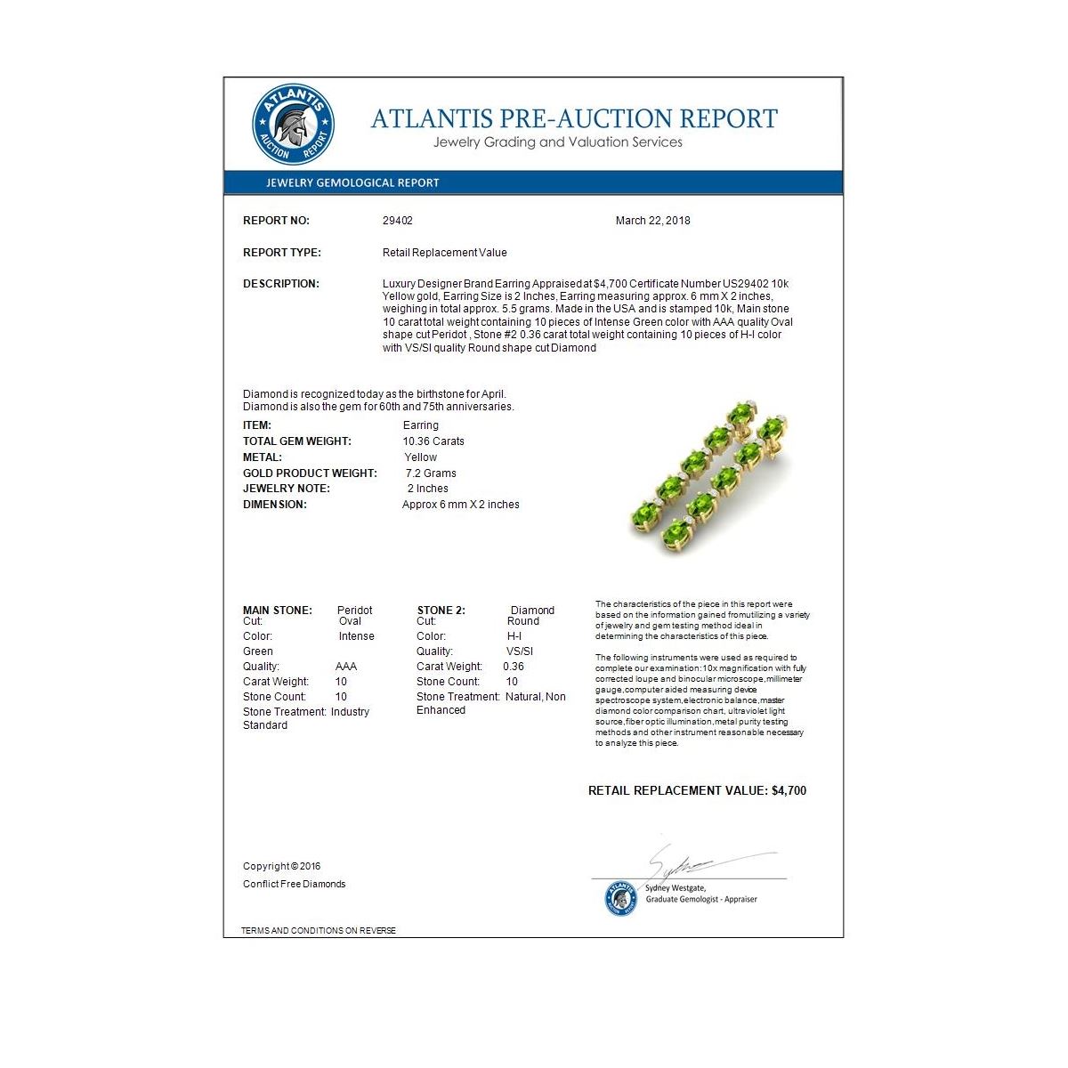 REF-65N8Y -29402 ---- 10.36 CTW Peridot & VS/SI Certified Diamond Earrings 10K Yellow Gold ---- Luxury Designer Brand Earring Appraised at $4,700 Certificate Number US29402 10k Yellow gold, Earring Size is 2 Inches, Earring measuring approx. 6 mm X 2 inches, weighing in total approx. 5.5 grams. Made in the USA and is stamped 10k, Main stone 10 carat total weight containing 10 pieces of Intense Green color with AAA quality Oval shape cut Peridot , Stone #2 0.36 carat total weight containing 10 pieces of H-I color with VS/SI quality Round shape cut Diamond