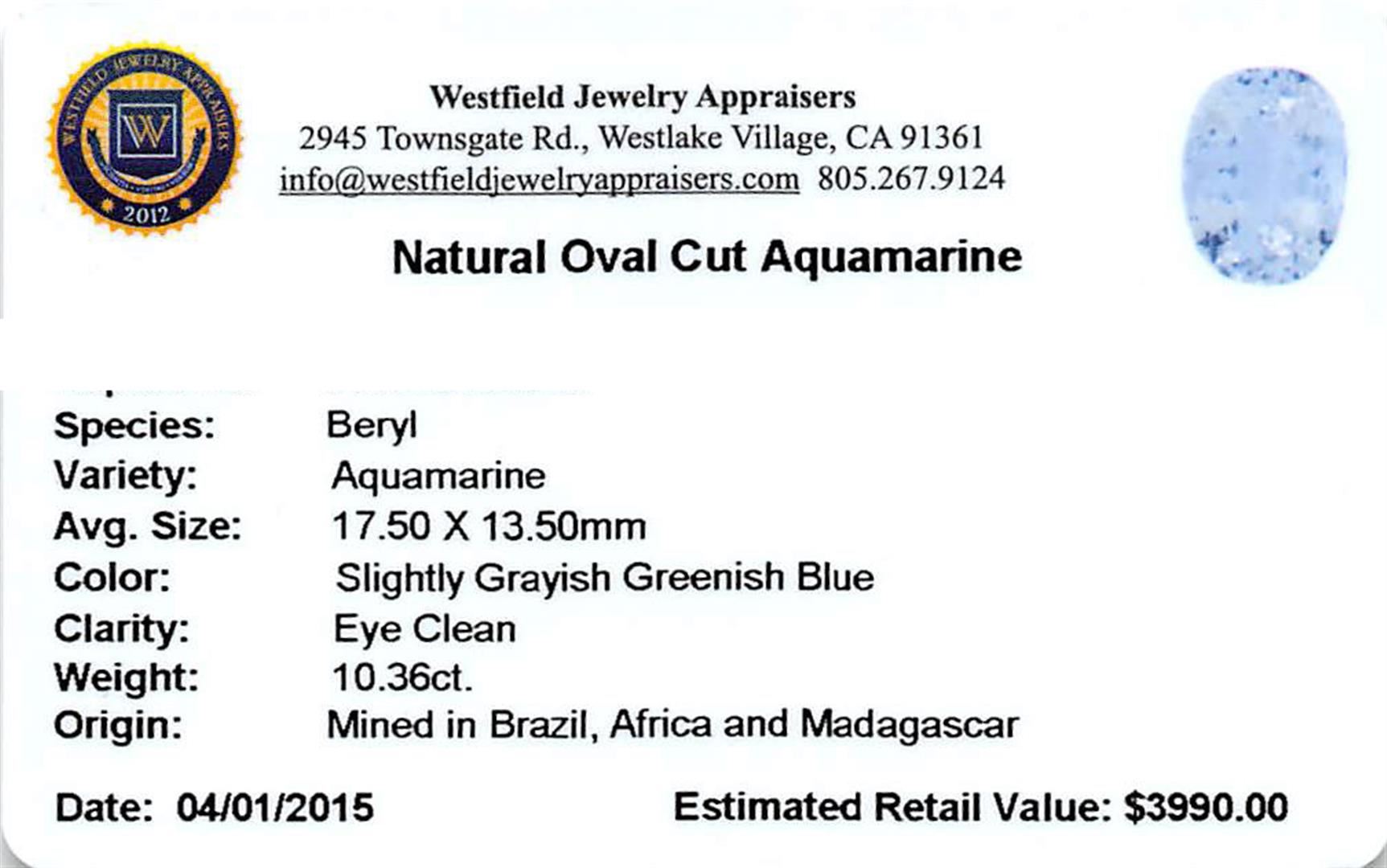 One oval cut natural aquamarine exact weight 10.36ct., clarity is eye clean, type I, medium light, very slightly grayish, very slightly greenish blue color, (GIA vslgB 4/3), cut is good. Westfield Appraised at $3,990.00.