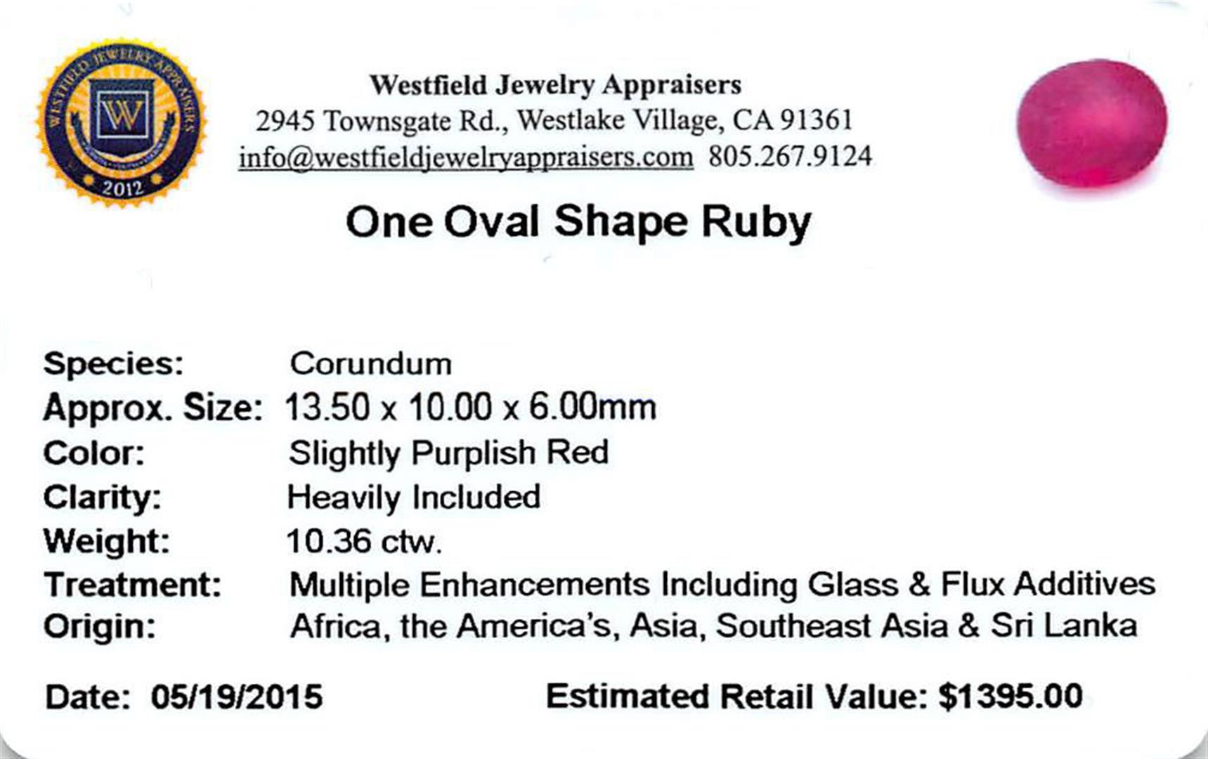One oval mixed cut natural ruby, measuring 13.50 x 10.00 x 6.00mm, exact weight 10.36ct., clarity is heavily included, type II, medium dark, very slightly brownish, slightly purplish red color, (GIA slpR 6/3), cut is good. Westfield Appraised at $1,395.00.