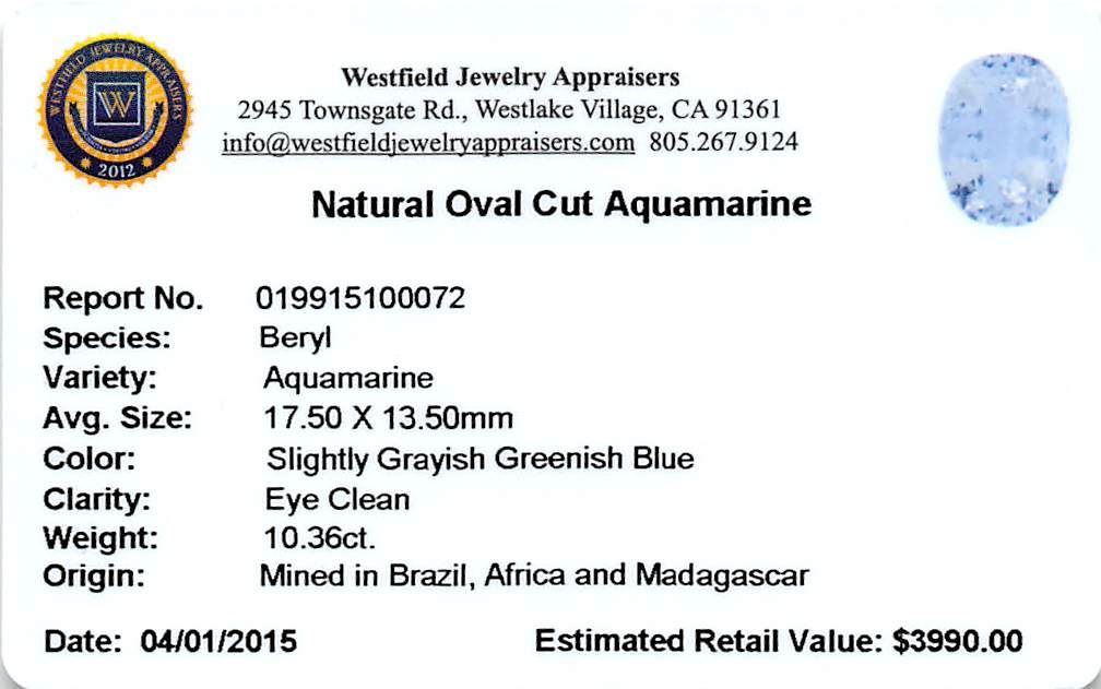 One oval cut natural aquamarine exact weight 10.36ct., clarity is eye clean, type I, medium light, very slightly grayish, very slightly greenish blue color, (GIA vslgB 4/3), cut is good. Westfield Appraised at $3,990.00.