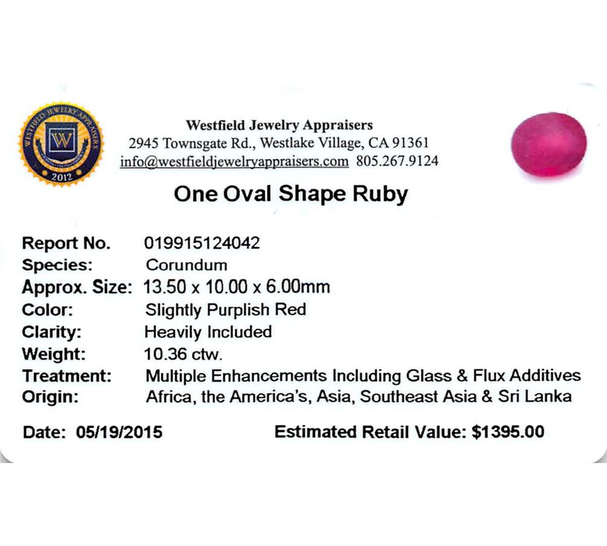 One oval mixed cut natural ruby, measuring 13.50 x 10.00 x 6.00mm, exact weight 10.36ct., clarity is heavily included, type II, medium dark, very slightly brownish, slightly purplish red color, (GIA slpR 6/3), cut is good. Westfield Appraised at $1,395.00.