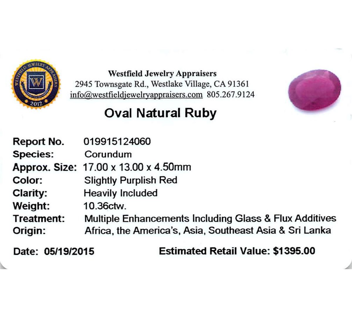 One oval mixed cut natural ruby, measuring 17.00 x 13.00 x 4.50mm, exact weight 10.36ct., clarity is heavily included, type II, medium dark, very slightly brownish, slightly purplish red color, (GIA slpR 6/3), cut is good. Transmitting light somewhat diffusely, transparent to translucent. Naturally occurring internal & external characteristics are present. Indications of laboratory high temperature heat treatment, with glass & flux additives. Ruby has a low tolerance to rhodium plating, repolishing the surface, & ultrasonic cleaning. Westfield Appraised at $1,395.00.