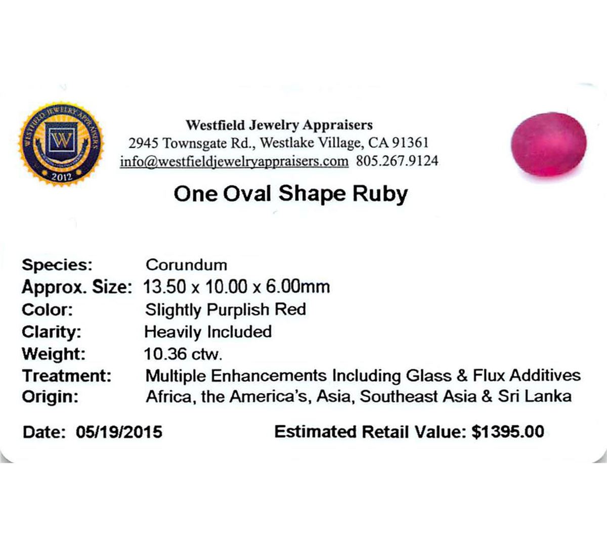 One oval mixed cut natural ruby, measuring 13.50 x 10.00 x 6.00mm, exact weight 10.36ct., clarity is heavily included, type II, medium dark, very slightly brownish, slightly purplish red color, (GIA slpR 6/3), cut is good. Westfield Appraised at $1,395.00.