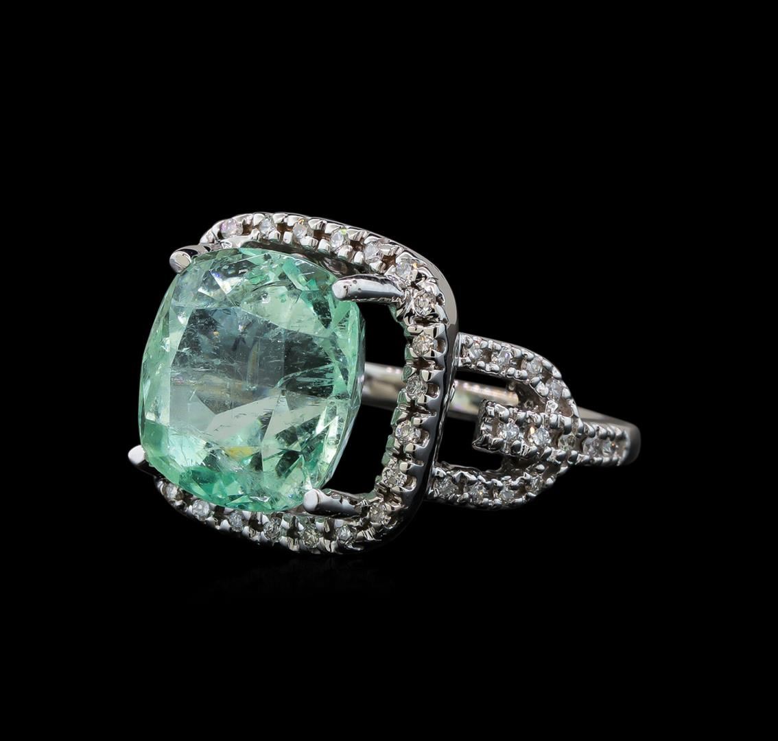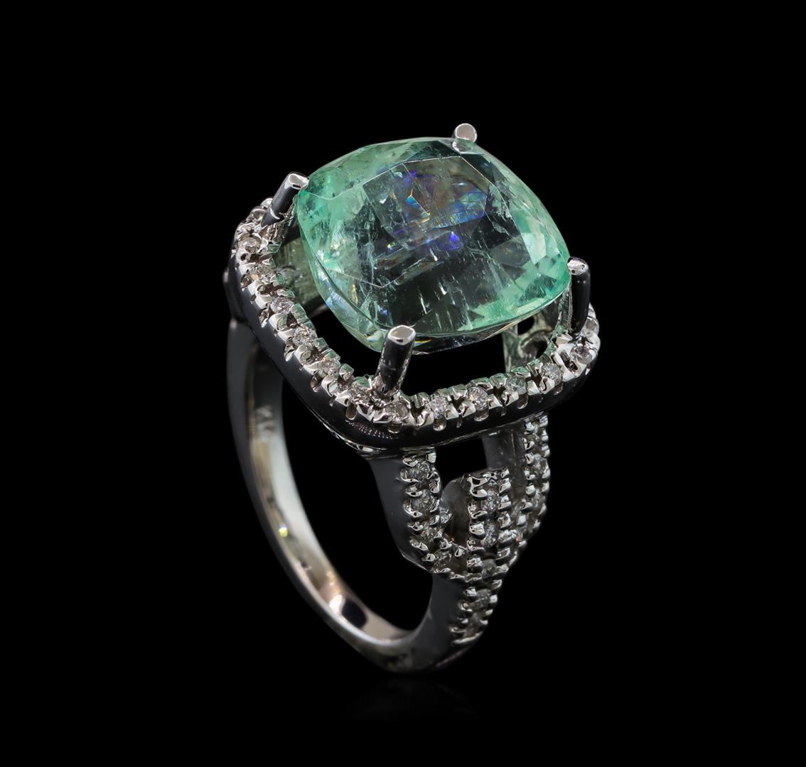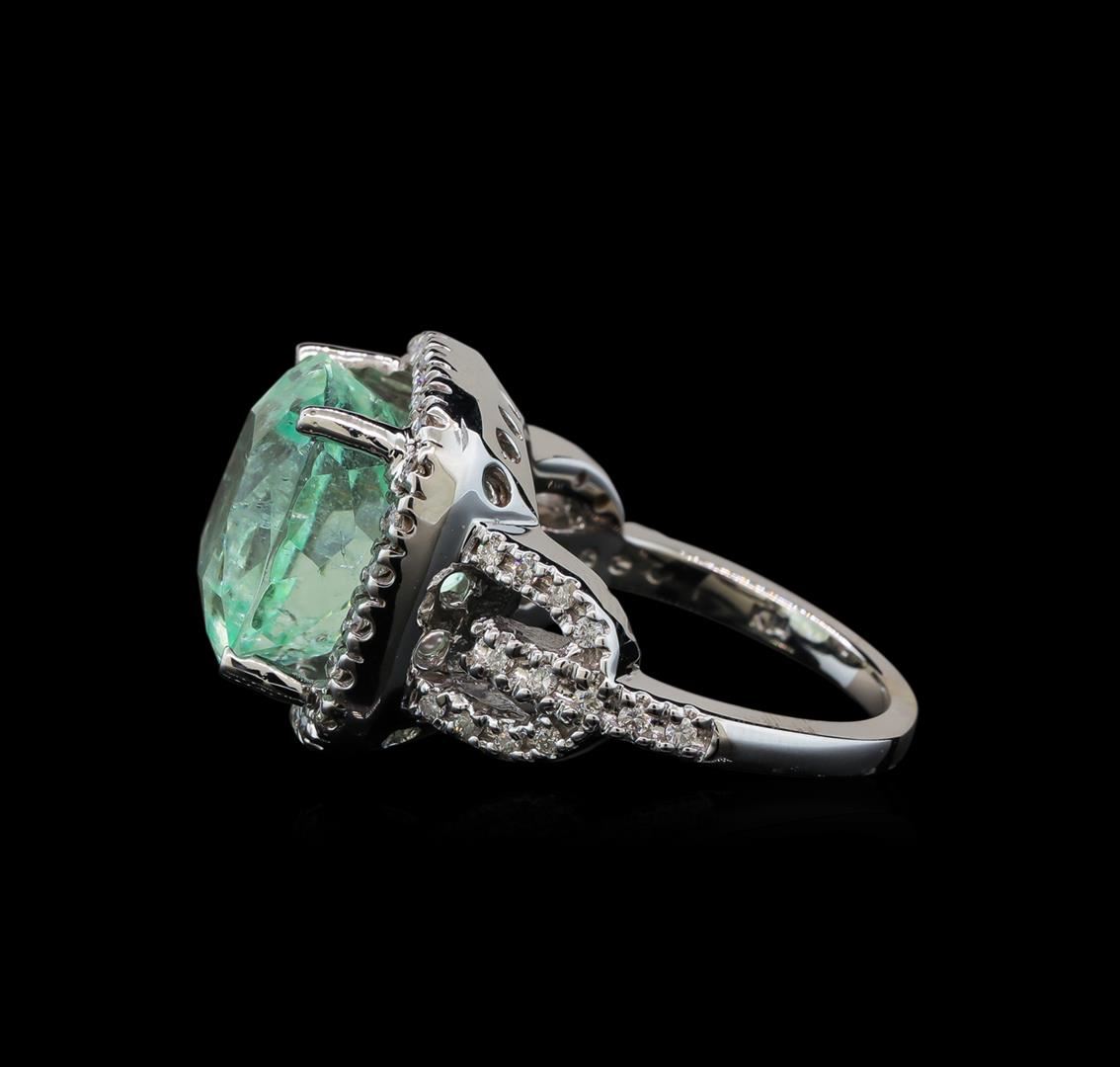 One electronically tested 14KT white gold lady's cast fashion ring with a split shank basket halo with a bright polish finish. The featured lady's ring has a shank measuring 1.97 millimeters wide. Identified with markings of 'K14'. Condition is new, good workmanship. Containing: One prong set square cushion modified brilliant cut natural emerald, measuring 13.37 x 12.96 x 10.60mm, (depth est.) approximate weight of 10.37ct., clarity is moderately included, light, moderately strong, green color, (GIA G 3/4), cut is good. Transmitting light somewhat diffusely, transparent to translucent. Naturally occurring internal & external characteristics are present. Indications of oil residue. Clarity enhanced. Colored gemstones are presumed to have been subjected to commonly used enhancement processes. Graded in the setting. Fifty prong set round brilliant cut diamonds, measuring 1.35 - 1.25 x 0.81mm (depth est.) approximate total weight of 50 Stones = 0.42ct. Graded in the setting. Clarity SI-1 to I-1. Color: H - I Cut Good. Total Weight of Colored Stones 10.37ct.. Total Weight of Diamonds 0.42ct.. Total Weight of Ring 12.10gm GAS Appraised at $12,035.00.