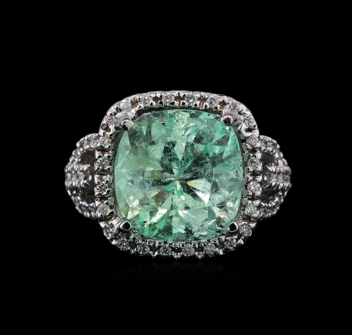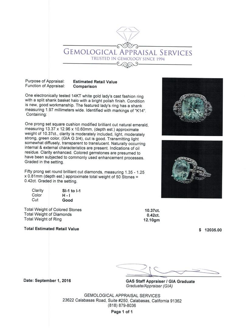 One electronically tested 14KT white gold lady's cast fashion ring with a split shank basket halo with a bright polish finish. The featured lady's ring has a shank measuring 1.97 millimeters wide. Identified with markings of 'K14'. Condition is new, good workmanship. Containing: One prong set square cushion modified brilliant cut natural emerald, measuring 13.37 x 12.96 x 10.60mm, (depth est.) approximate weight of 10.37ct., clarity is moderately included, light, moderately strong, green color, (GIA G 3/4), cut is good. Transmitting light somewhat diffusely, transparent to translucent. Naturally occurring internal & external characteristics are present. Indications of oil residue. Clarity enhanced. Colored gemstones are presumed to have been subjected to commonly used enhancement processes. Graded in the setting. Fifty prong set round brilliant cut diamonds, measuring 1.35 - 1.25 x 0.81mm (depth est.) approximate total weight of 50 Stones = 0.42ct. Graded in the setting. Clarity SI-1 to I-1. Color: H - I Cut Good. Total Weight of Colored Stones 10.37ct.. Total Weight of Diamonds 0.42ct.. Total Weight of Ring 12.10gm GAS Appraised at $12,035.00.