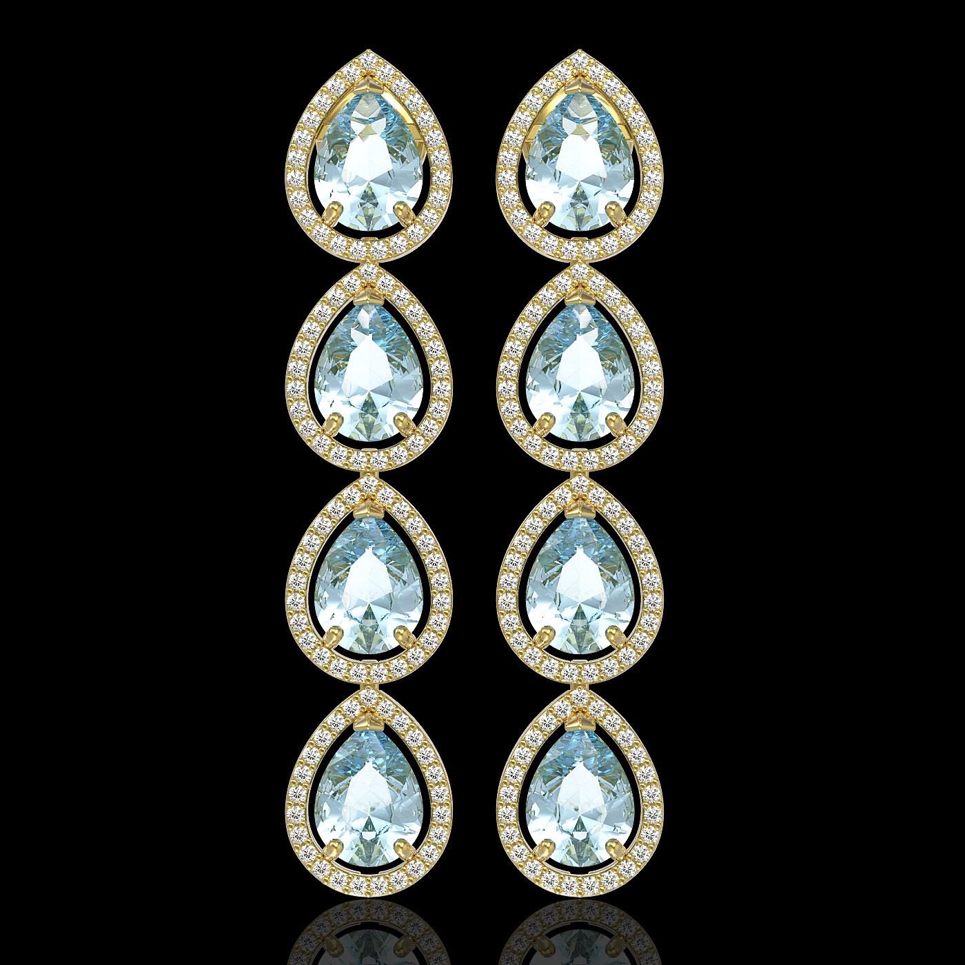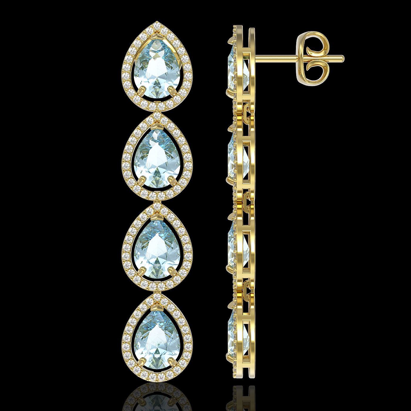 REF-152M2H -41314 ---- 10.4 CTW Sky Topaz & Diamond Halo Earrings 10K Yellow Gold ---- Luxury Designer Brand Earring Appraised at $8,350 Certificate Number US41314 10k Yellow gold, Earring Size is 2 Inches Long, Earring measuring approx. 10 mm x 2 Inches, weighing in total approx. 8 grams. Made in the USA and is stamped 10k, Main stone 8.8 carat total weight containing 8 pieces of Translucent Sky Blue color with AAA quality Pear shape cut Topaz Sky , Stone #2 1.6 carat total weight containing 200 pieces of G-H color with VS/SI quality Round shape cut Diamond