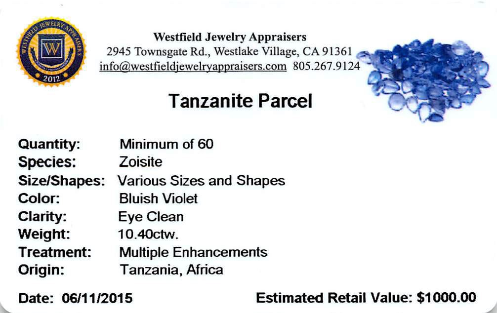 _x000D_Sixty mixed cut natural tanzanites exact total weight 10.40ct., clarity is eye clean, type I, medium dark, very slightly grayish, bluish violet color, (GIA bV 6/3), cut is good. Transmitting light with no distortion, transparent. Color grade is an average for the group. Graded in the setting. Tanzanite is a very rare gemstone that is only found in the country of Tanzania. Originally discovered in 1967. Tiffany & Company, named the stone Tanzanite. It is found in the Usumburu Mountains that border the Umba Valley of northern Tanzania. Tanzanite occurs in gray, brown, violet, blue, reddish-purple, & green. The gem is interesting because of its exceptional pleochroism. Rotated in different directions a tanzanite will exhibit multiple changes of color. Tanzanite has a low tolerance to ultrasonic cleaning, and should not be cleaned using this method. Westfield Appraised at $1,000.00.