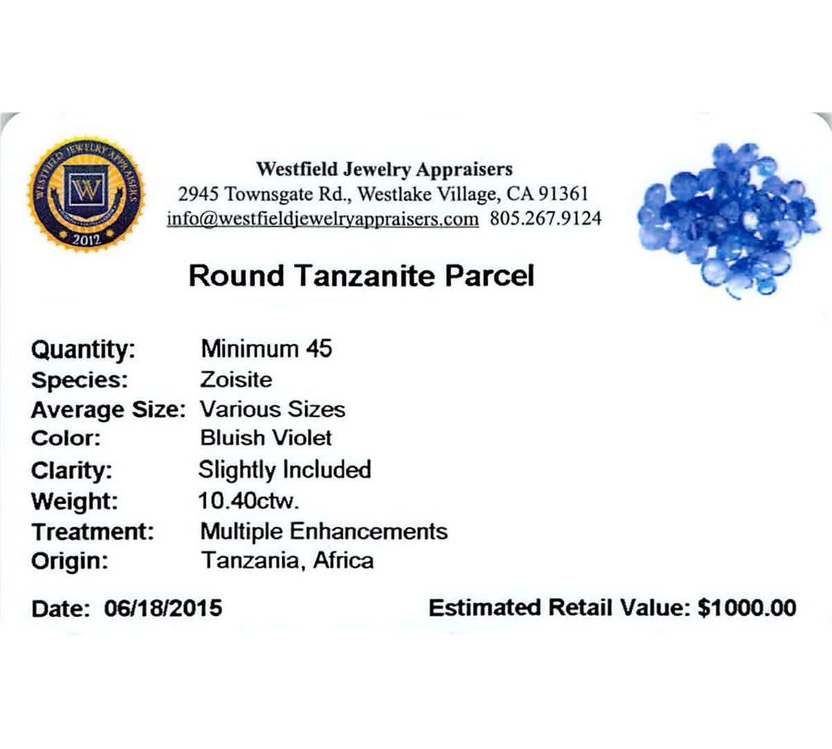 Forty-five round mixed cut natural tanzanites exact total weight 10.40ct., clarity is slightly included, type I, medium dark, very slightly grayish, bluish violet color, (GIA bV 6/3), cut is good. Transmitting light with a minimum of distortion, transparent. Naturally occurring internal & external characteristics are present. Color grade is an average for the group. Tanzanite is a very rare gemstone that is only found in the country of Tanzania. Originally discovered in 1967. Tiffany & Company, named the stone Tanzanite. It is found in the Usumburu Mountains that border the Umba Valley of northern Tanzania. Tanzanite occurs in gray, brown, violet, blue, reddish-purple, & green. The gem is interesting because of its exceptional pleochroism. Rotated in different directions a tanzanite will exhibit multiple changes of color. Tanzanite has a low tolerance to ultrasonic cleaning, and should not be cleaned using this method. Westfield Appraised at $1,000.00.