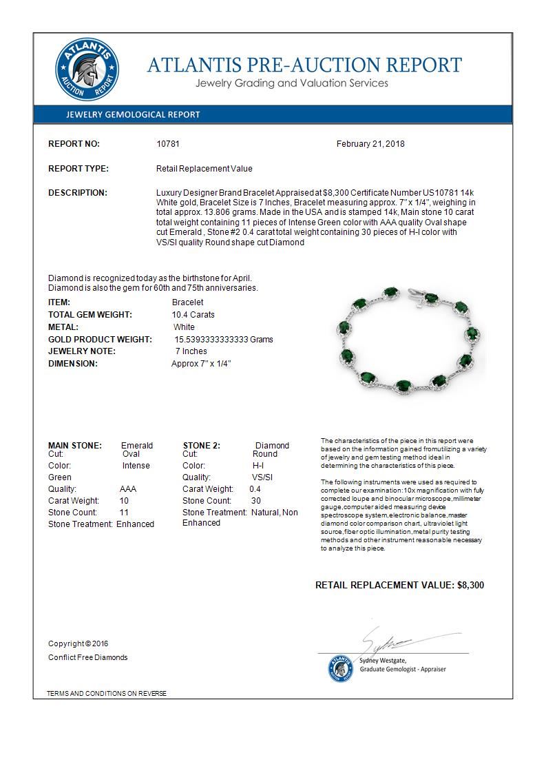 REF-115W8F -10781 ---- 10.40 CTW Emerald & Diamond Bracelet 14K White Gold ---- Luxury Designer Brand Bracelet Appraised at $8,300 Certificate Number US10781 14k White gold, Bracelet Size is 7 Inches, Bracelet measuring approx. 7" x 1/4", weighing in total approx. 13.806 grams. Made in the USA and is stamped 14k, Main stone 10 carat total weight containing 11 pieces of Intense Green color with AAA quality Oval shape cut Emerald , Stone #2 0.4 carat total weight containing 30 pieces of H-I color with VS/SI quality Round shape cut Diamond