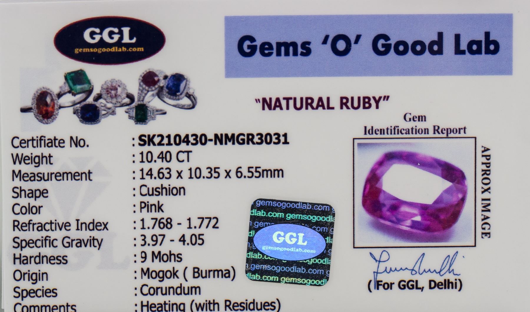 One (1) 10.40 ct cushion cut pink natural ruby. Origin: Mogok (Burma). Accompanied with GGL certificate. 14.63 x 10.35 x 6.55 mm.