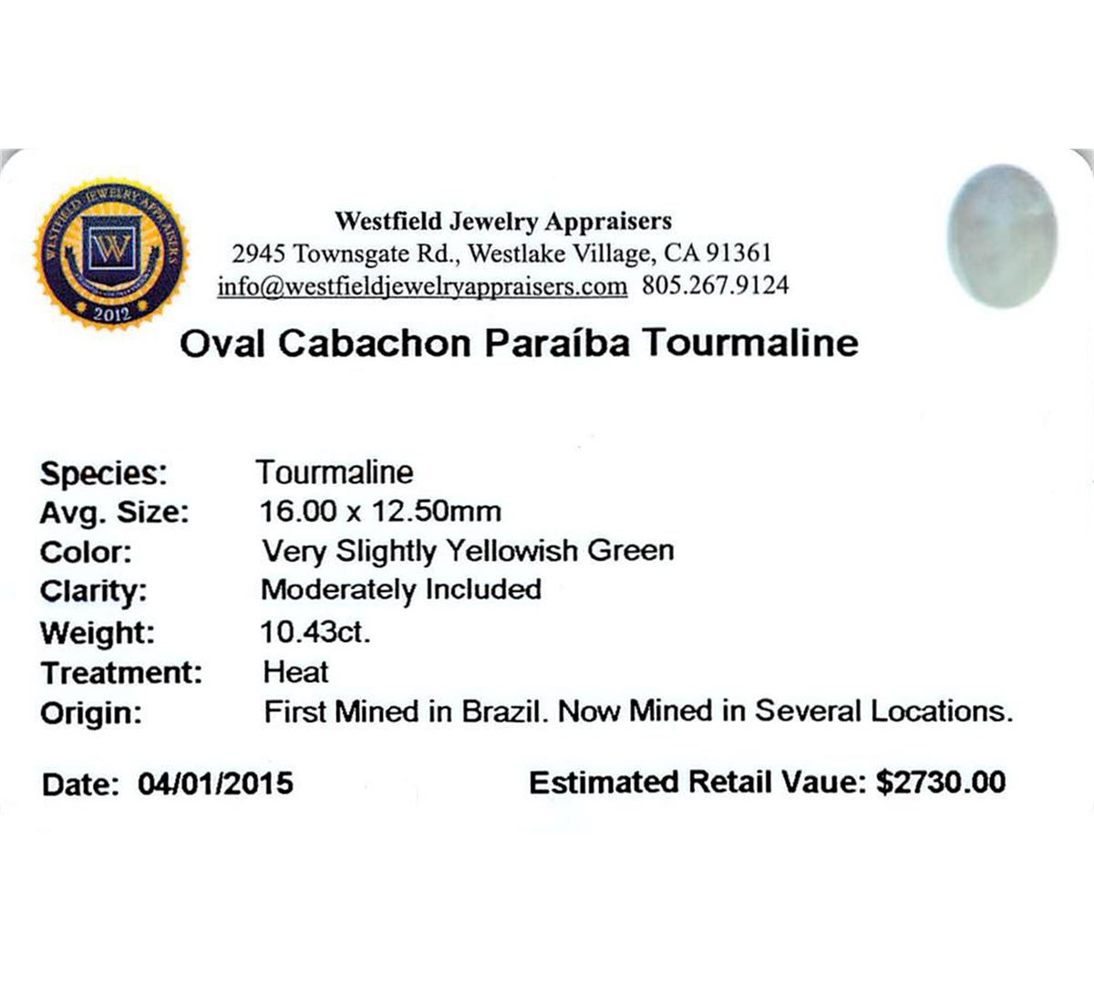 One oval cabochon cut natural Paraiba tourmaline exact weight 10.43ct., clarity is moderately included, cut is good. Westfield Appraised at $2,730.00.