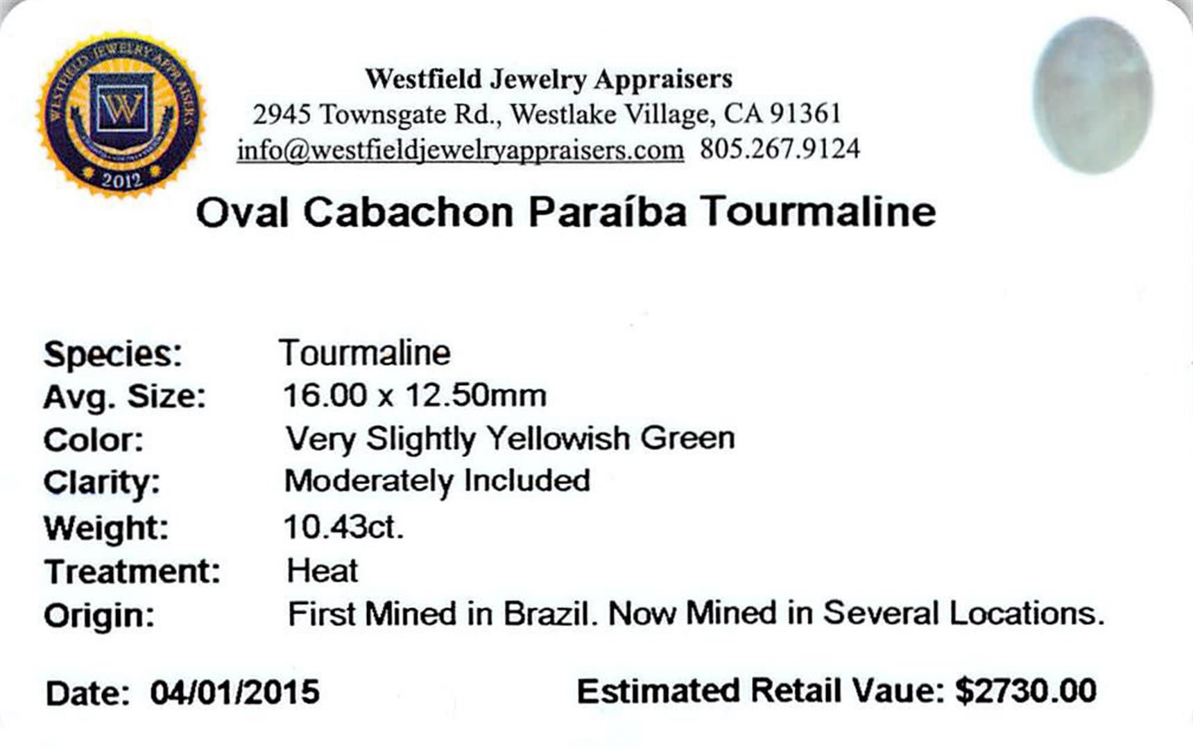 One oval cabochon cut natural Paraiba tourmaline exact weight 10.43ct., clarity is moderately included, cut is good. Westfield Appraised.