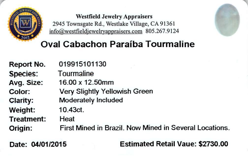 One oval cabochon cut natural Paraiba tourmaline exact weight 10.43ct., clarity is moderately included, cut is good. Westfield Appraised at $2,730.00.