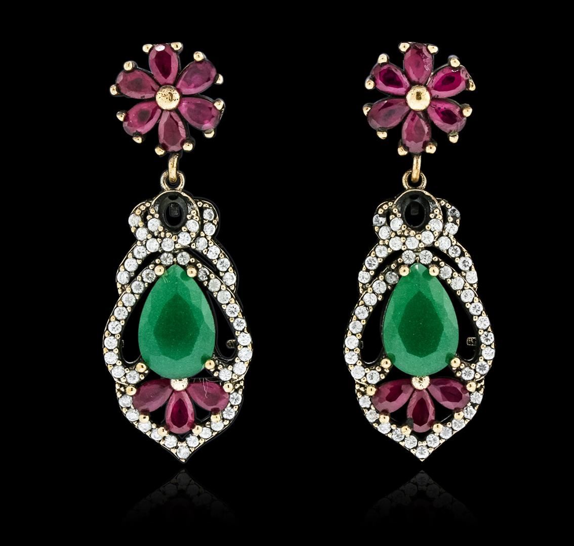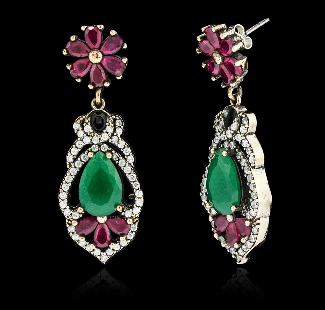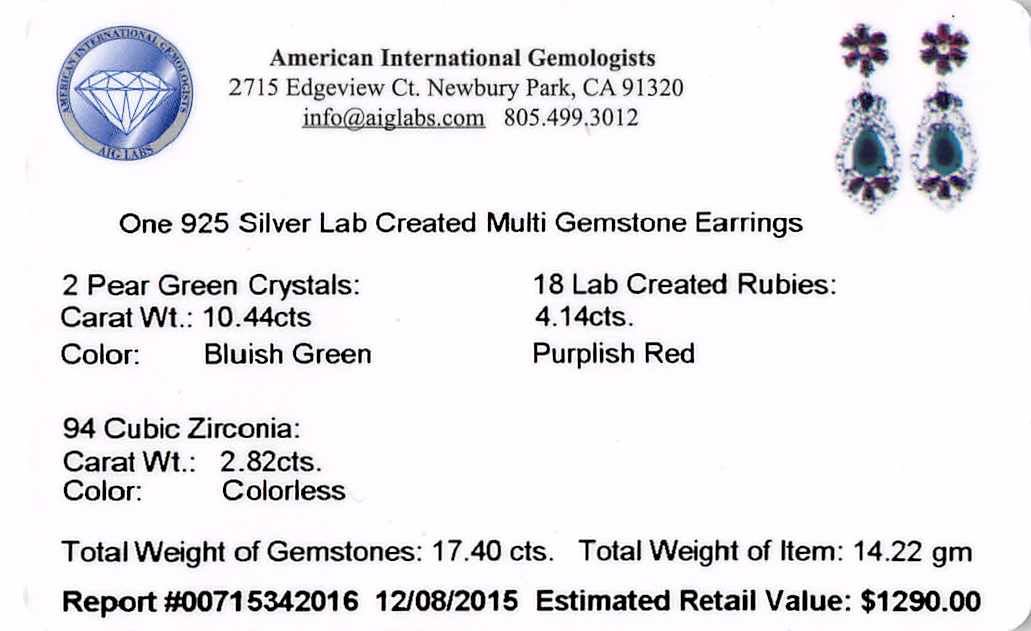 One 10.44ctw Green Crystal and Multi Gemstone Earrings - 925 SILVER. Bright and anodized finish. Identified with markings of "925". Condition is new, good workmanship. Containing: Two prong set pear mixed cut laboratory created green crystals, measuring 12.00 x 7.50 x 5.00mm, approximate total weight of 10.44ct., clarity is eye clean, medium dark, very slightly grayish, very slightly bluish green color, (GIA vslbG 6/3), cut is good. Eighteen prong set pear mixed cut laboratory created rubies, measuring 5.00 x 3.00 x 1.95mm, approximate total weight of 4.14ct., clarity is eye clean, type II, medium dark, very slightly brownish, slightly purplish red color, (GIA slpR 6/3), cut is good. Ninety-four prong set round brilliant cut laboratory created cubic zirconias, measuring 1.70 - 1.50 x 1.04 mm, approximate total weight of 2.82ct., clarity is eye clean, colorless, very slightly grayish, white color, (GIA W 0/3), cut is good. Total Weight of Colored Stones 17.40ct. Total Weight of Earrings 14.22gm. AIG Appraised at $1,290.00.