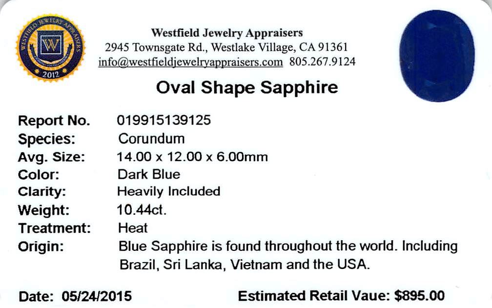 One oval mixed cut natural blue sapphire, measuring 14.00 x 12.00 x 6.00mm, exact weight 10.44ct., clarity is heavily included, type II, dark, very slightly grayish, blue color, (GIA B 7/3), cut is good. Transmitting light very diffusely, opaque. Naturally occurring internal & external characteristics are present. Indications of multiple laboratory enhancements, including high temperature heat treatment. Westfield Appraised at $895.00.