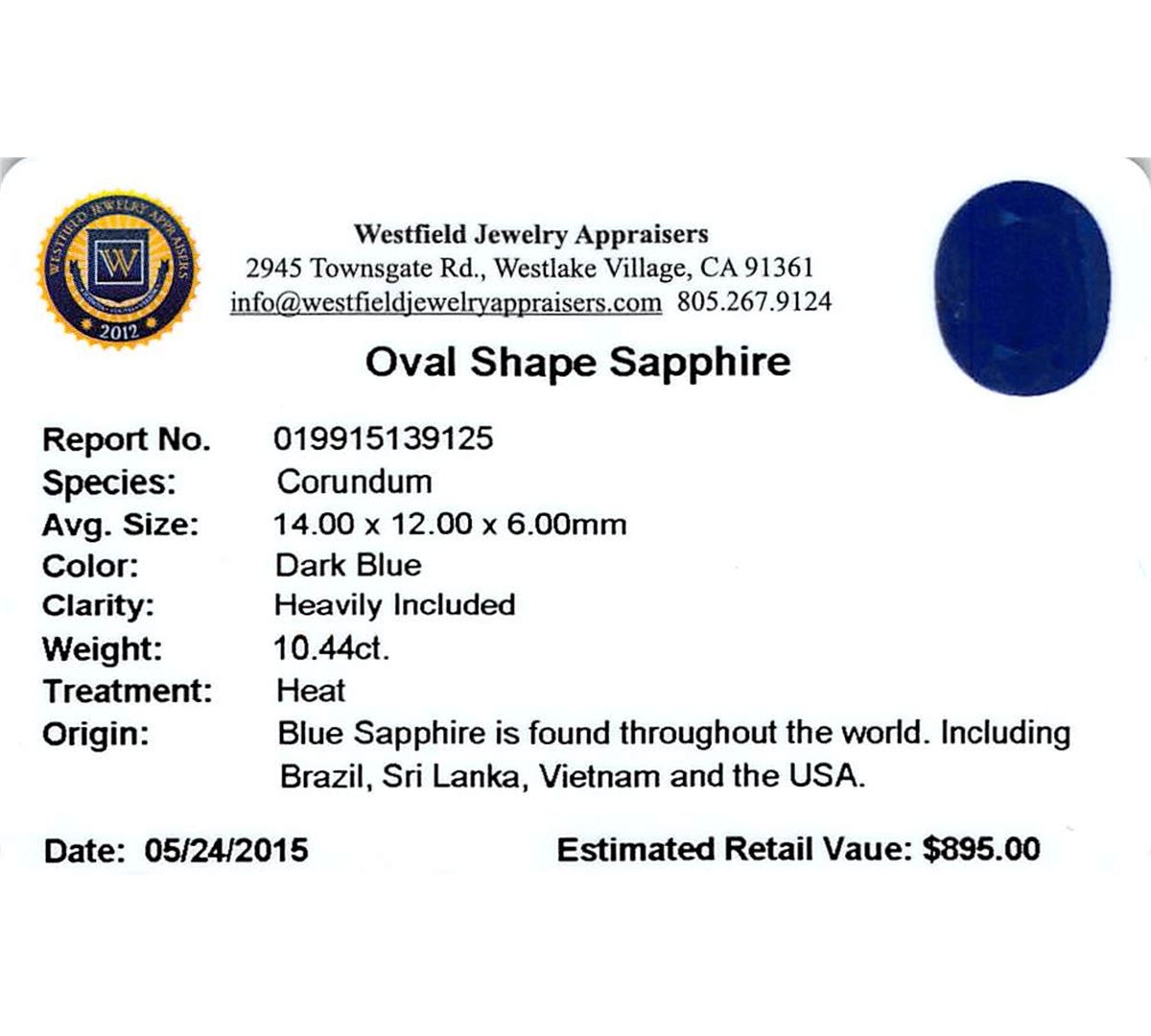 One oval mixed cut natural blue sapphire, measuring 14.00 x 12.00 x 6.00mm, exact weight 10.44ct., clarity is heavily included, type II, dark, very slightly grayish, blue color, (GIA B 7/3), cut is good. Transmitting light very diffusely, opaque. Naturally occurring internal & external characteristics are present. Indications of multiple laboratory enhancements, including high temperature heat treatment. Westfield Appraised at $895.00.