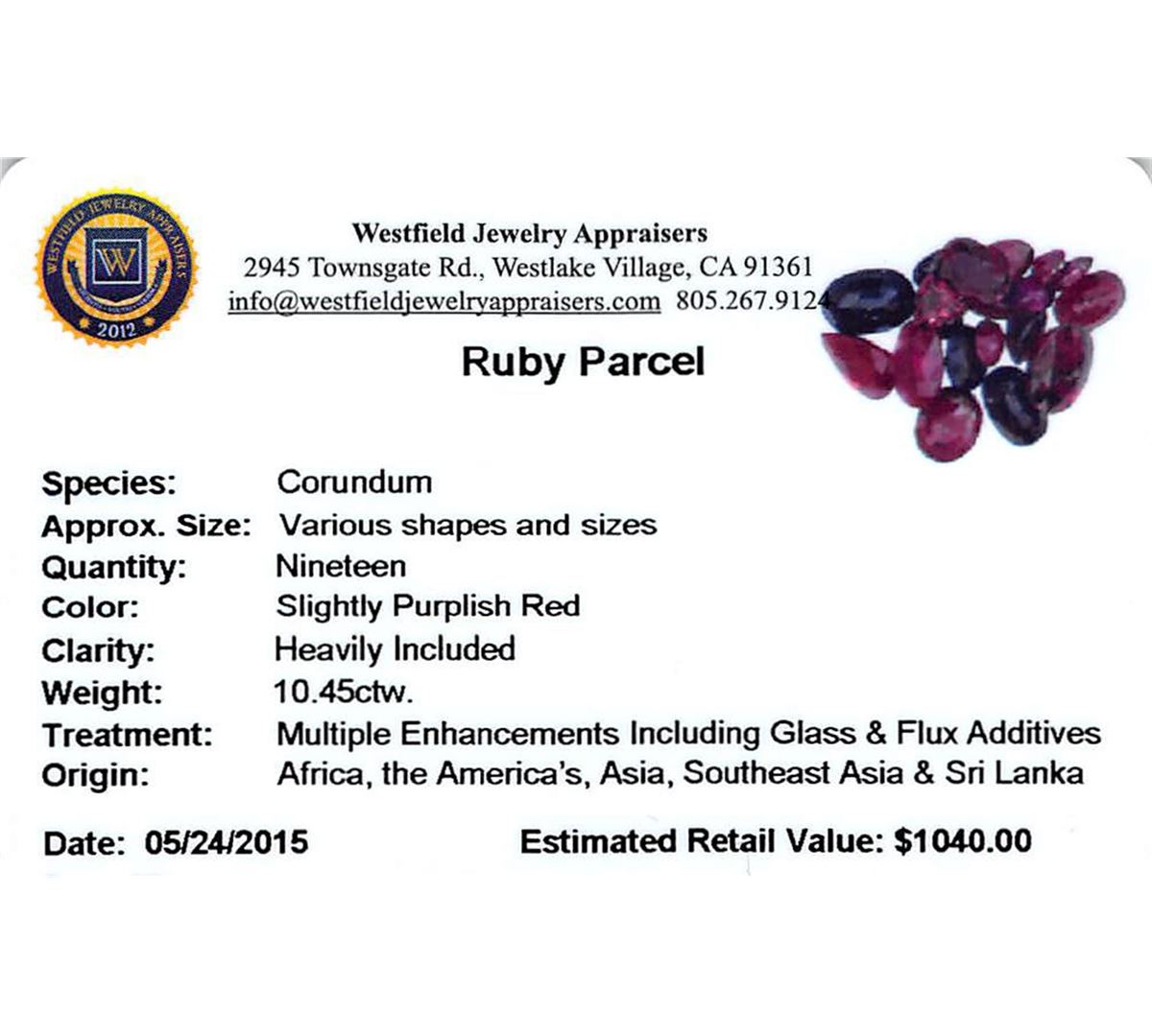Nineteen various shapes & sizes cut natural rubies exact total weight 10.45ct., clarity is heavily included, type II, dark, very slightly brownish, slightly purplish red color, (GIA slpR 7/3), cut is good. Transmitting light somewhat diffusely, transparent to translucent. Naturally occurring internal & external characteristics are present. Indications of laboratory high temperature heat treatment, with glass & flux additives. Ruby has a low tolerance to rhodium plating, repolishing the surface, & ultrasonic cleaning. Westfield Appraised at $1,040.00.