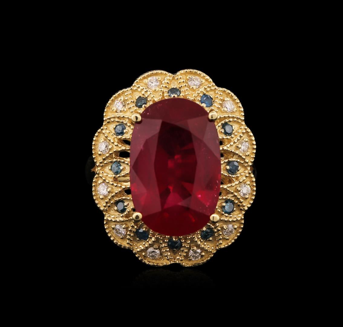 One ring featuring: 14KT yellow gold weighing 9.20 grams containing one ruby center stone with a total weight of 10.45ct and 24 white and bluish/green diamonds with a total weight of 0.37ct.