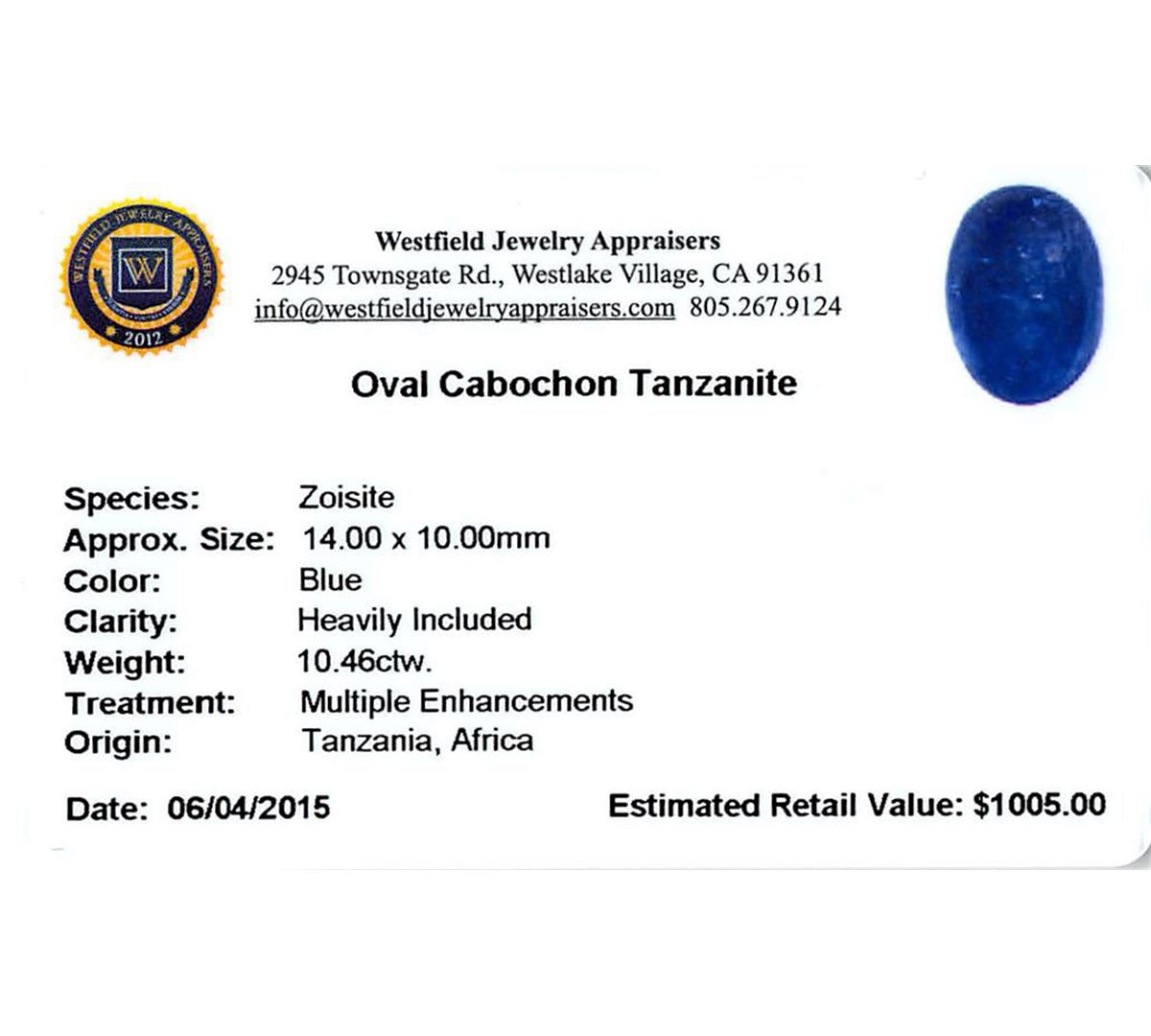 One oval cabochon cut natural tanzanite, measuring 15.00 x 11.00 x 7.00mm, exact weight 10.46ct., clarity is heavily included, type I, dark, moderately strong, blue color, (GIA B 7/4), cut is good. Transmitting light somewhat diffusely, transparent to translucent. Naturally occurring internal & external characteristics are present. Indications of heat treatment. Westfield Appraised at $1,005.00.