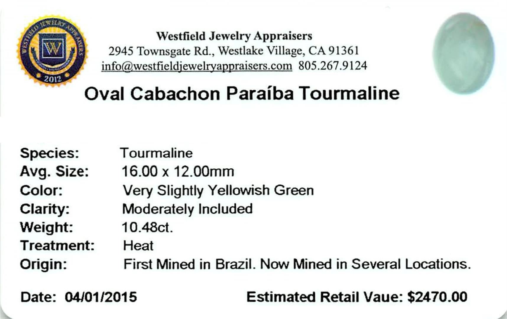 One oval cabochon cut natural Paraiba tourmaline exact weight 10.47ct., clarity is moderately included, cut is good. Westfield Appraised at $2,740.00.