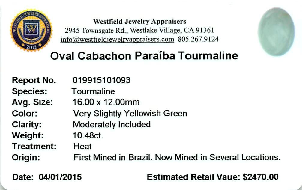 One oval cabochon cut natural Paraiba tourmaline exact weight 10.47ct., clarity is moderately included, cut is good. Westfield Appraised at $2,740.00.