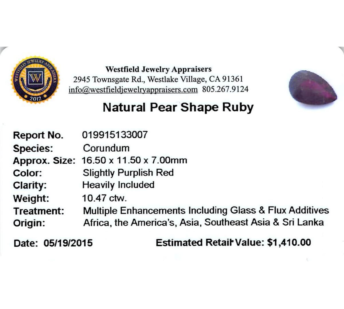 One pear mixed cut natural ruby, measuring 16.50 x 11.50 x 7.00mm, exact weight 10.47ct., clarity is heavily included, type II, dark, very slightly brownish, slightly purplish red color, (GIA slpR 7/3), cut is good. Transmitting light somewhat diffusely, transparent to translucent. Naturally occurring internal & external characteristics are present. Indications of laboratory high temperature heat treatment, with glass & flux additives. Ruby has a low tolerance to rhodium plating, repolishing the surface, & ultrasonic cleaning. Westfield Appraised at $1,410.00.