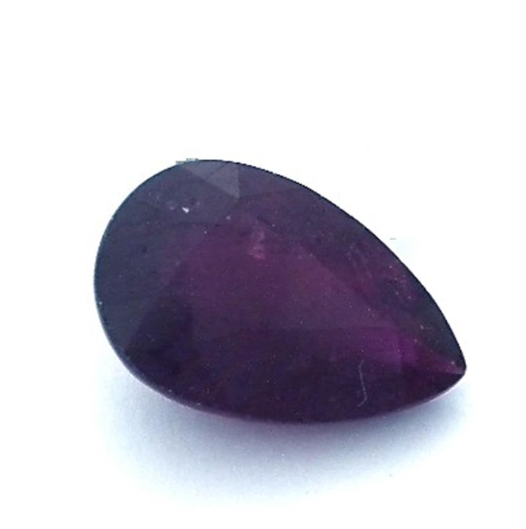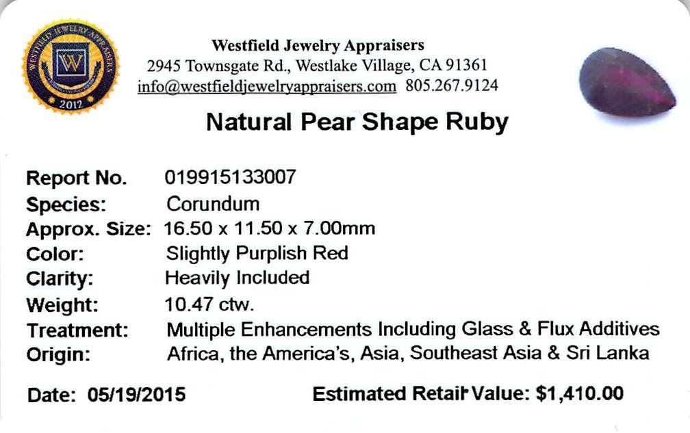 One pear mixed cut natural ruby, measuring 16.50 x 11.50 x 7.00mm, exact weight 10.47ct., clarity is heavily included, type II, dark, very slightly brownish, slightly purplish red color, (GIA slpR 7/3), cut is good. Transmitting light somewhat diffusely, transparent to translucent. Naturally occurring internal & external characteristics are present. Indications of laboratory high temperature heat treatment, with glass & flux additives. Ruby has a low tolerance to rhodium plating, repolishing the surface, & ultrasonic cleaning. Westfield Appraised at $1,410.00.