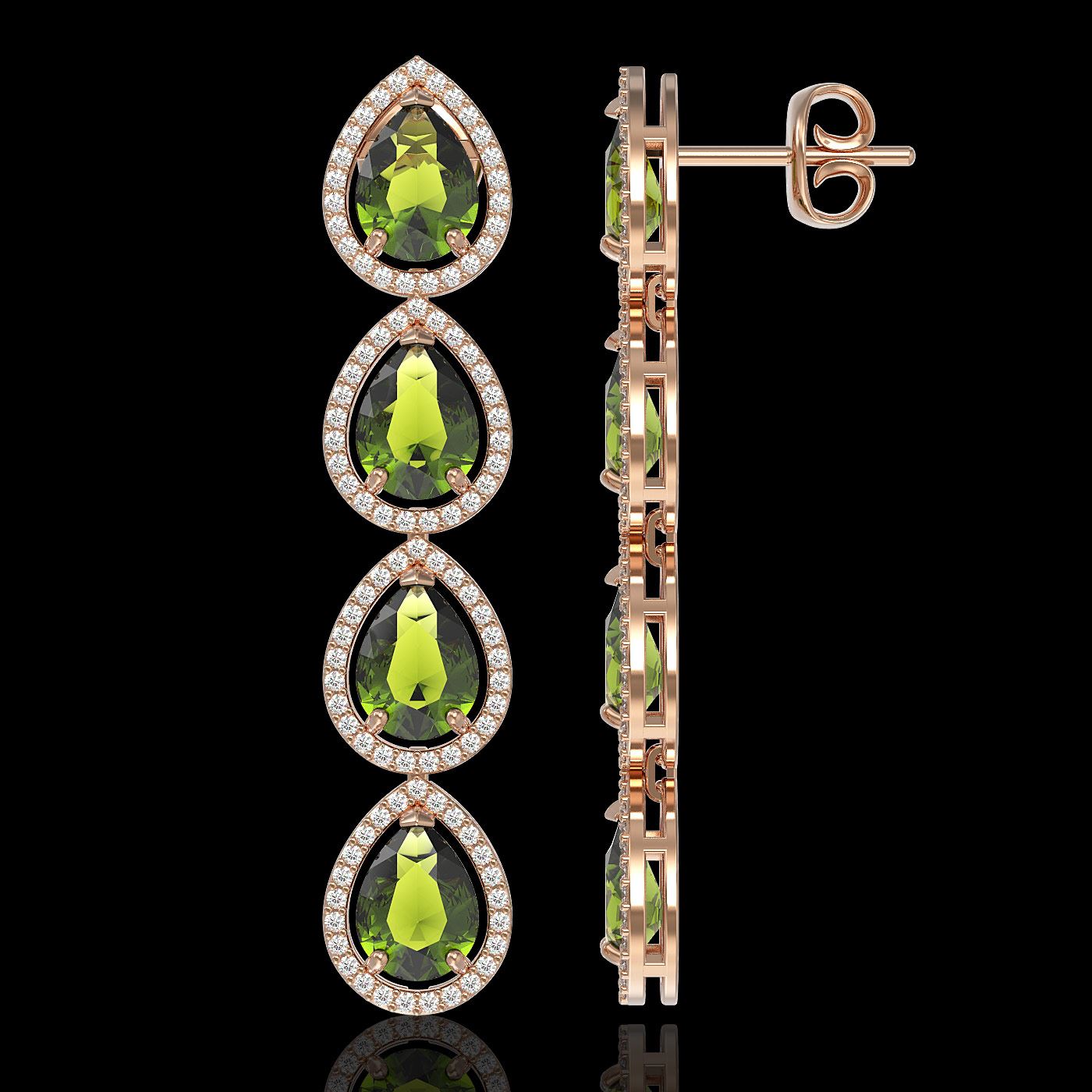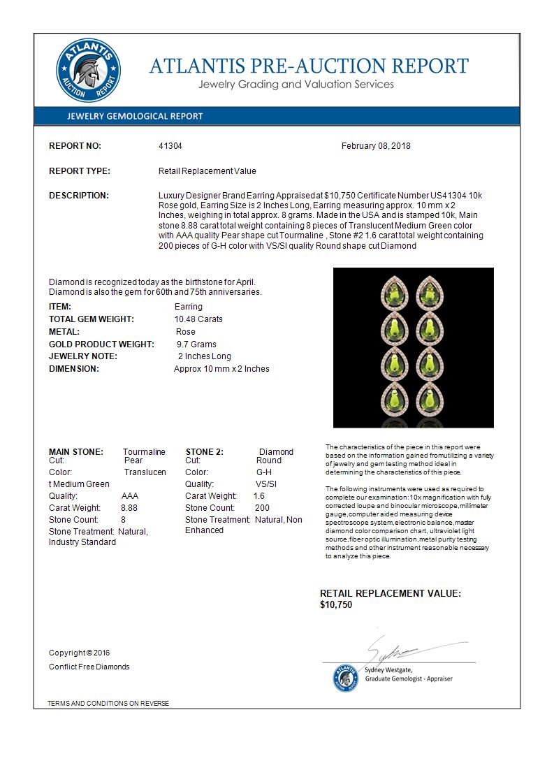 REF-195N6Y -41304 ---- 10.48 CTW Tourmaline & Diamond Halo Earrings 10K Rose Gold ---- Luxury Designer Brand Earring Appraised at $10,750 Certificate Number US41304 10k Rose gold, Earring Size is 2 Inches Long, Earring measuring approx. 10 mm x 2 Inches, weighing in total approx. 8 grams. Made in the USA and is stamped 10k, Main stone 8.88 carat total weight containing 8 pieces of Translucent Medium Green color with AAA quality Pear shape cut Tourmaline , Stone #2 1.6 carat total weight containing 200 pieces of G-H color with VS/SI quality Round shape cut Diamond