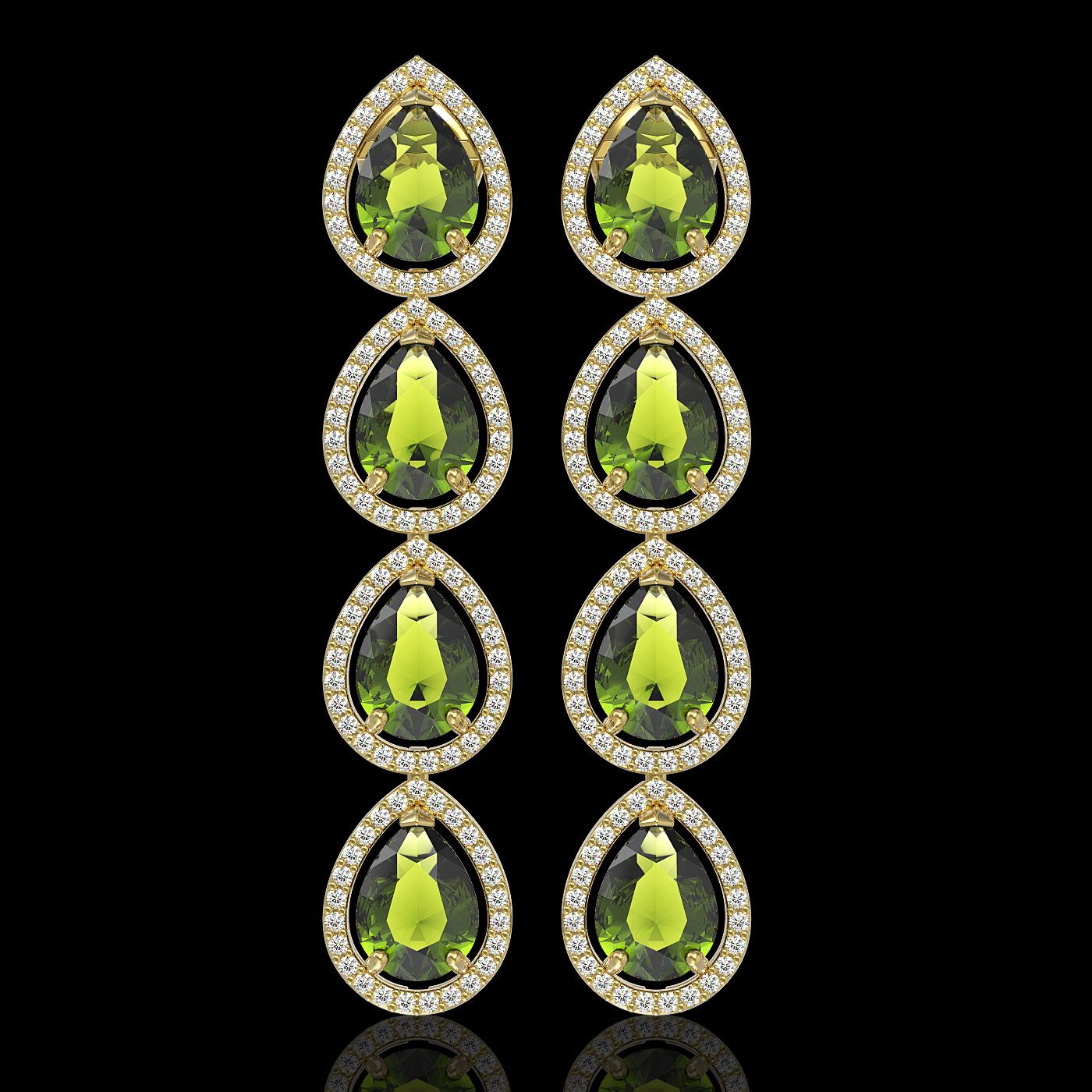 REF-195Y6K -41305 ---- 10.48 CTW Tourmaline & Diamond Halo Earrings 10K Yellow Gold ---- Luxury Designer Brand Earring Appraised at $10,750 Certificate Number US41305 10k Yellow gold, Earring Size is 2 Inches Long, Earring measuring approx. 10 mm x 2 Inches, weighing in total approx. 8 grams. Made in the USA and is stamped 10k, Main stone 8.88 carat total weight containing 8 pieces of Translucent Medium Green color with AAA quality Pear shape cut Tourmaline , Stone #2 1.6 carat total weight containing 200 pieces of G-H color with VS/SI quality Round shape cut Diamond
