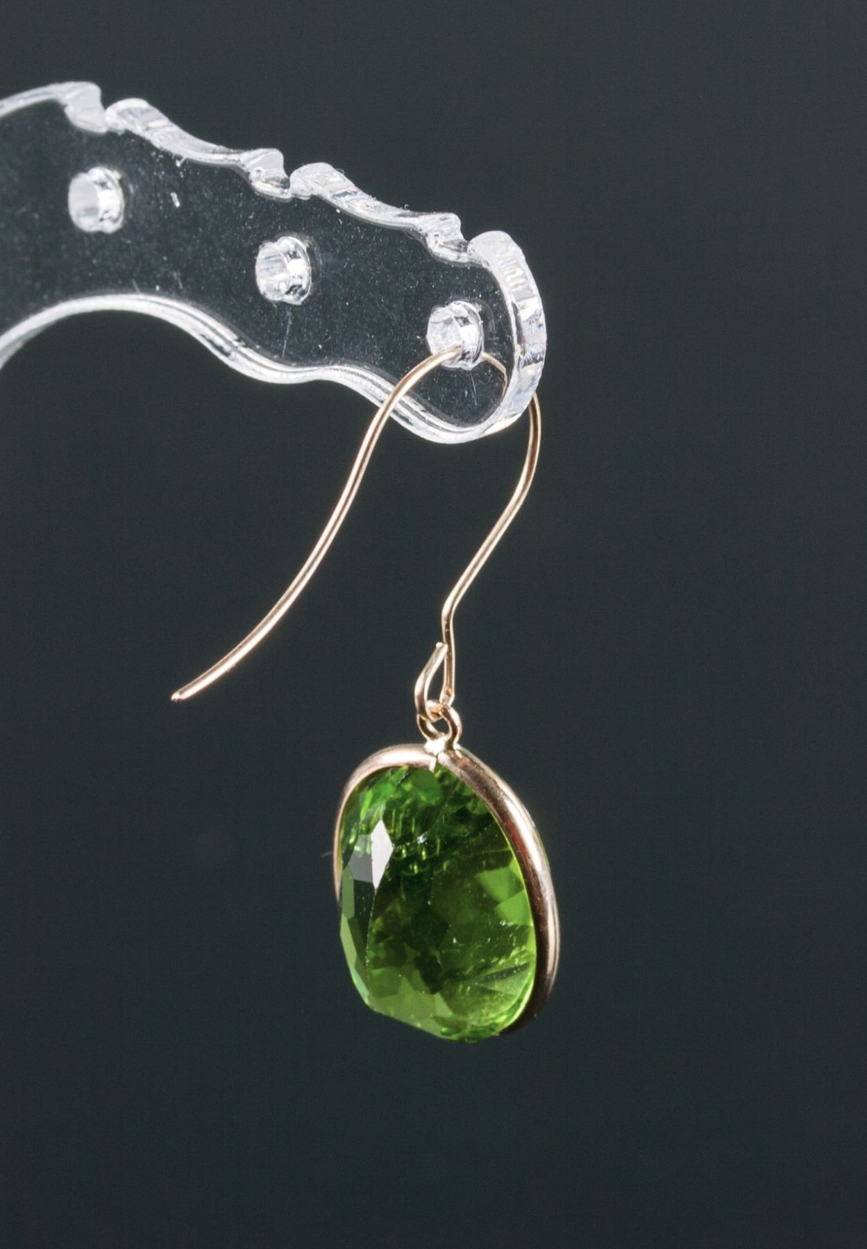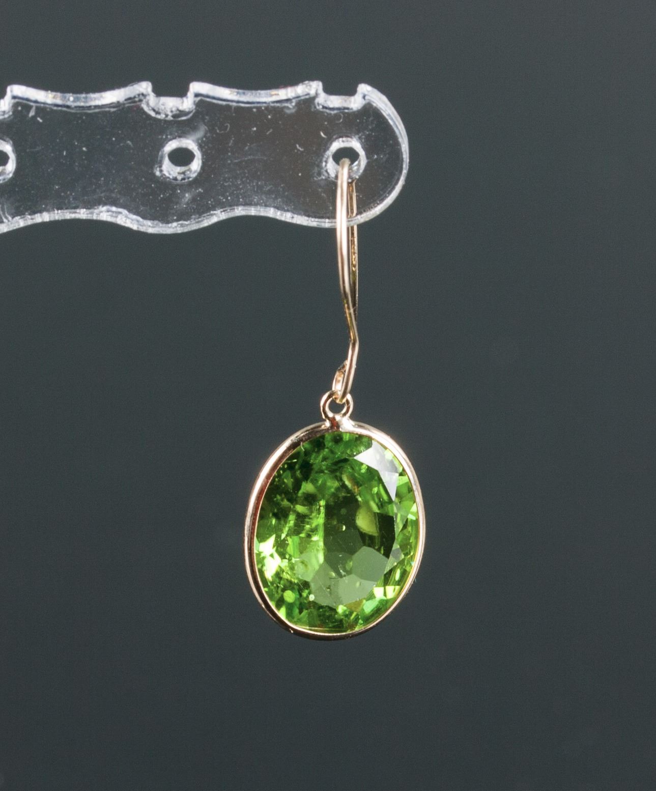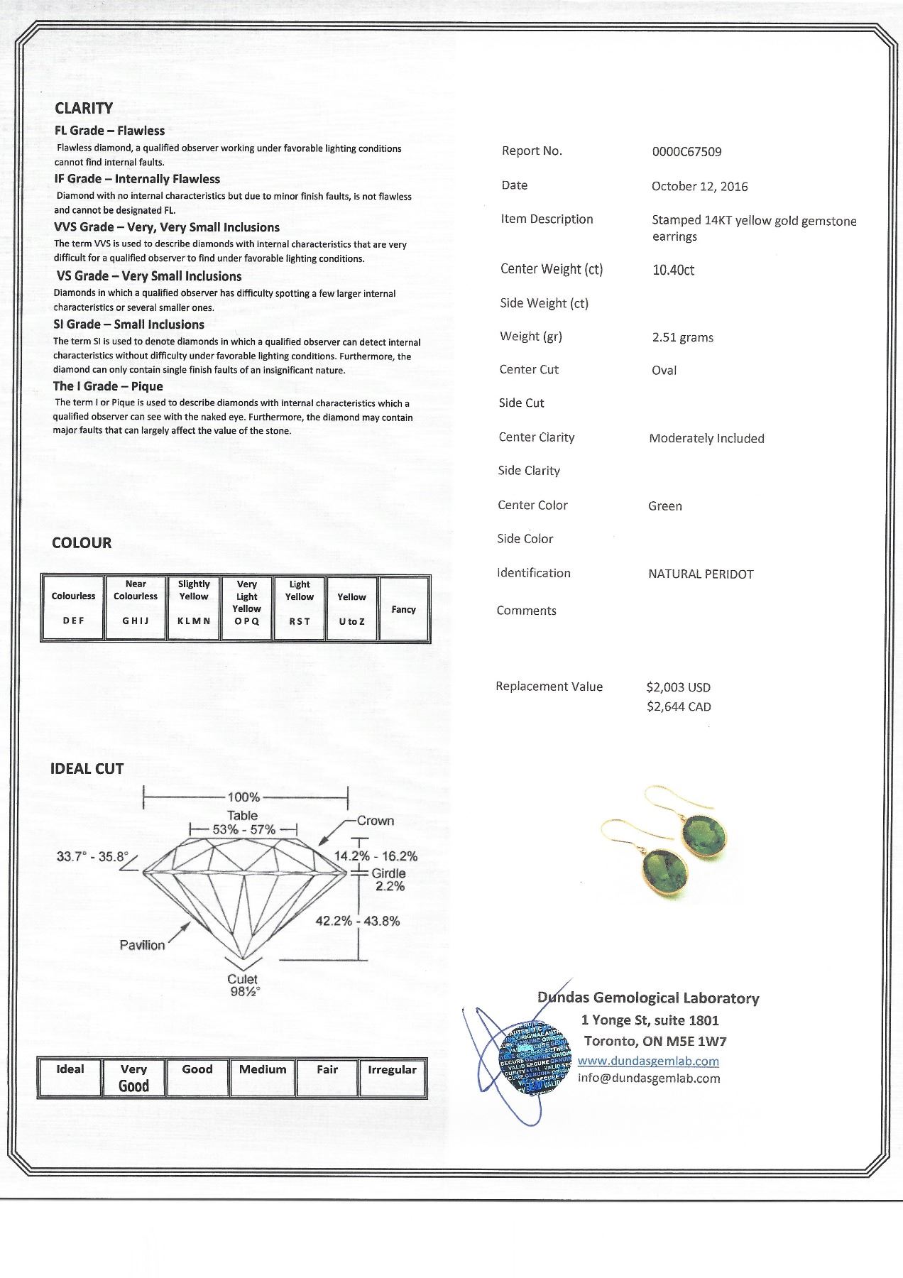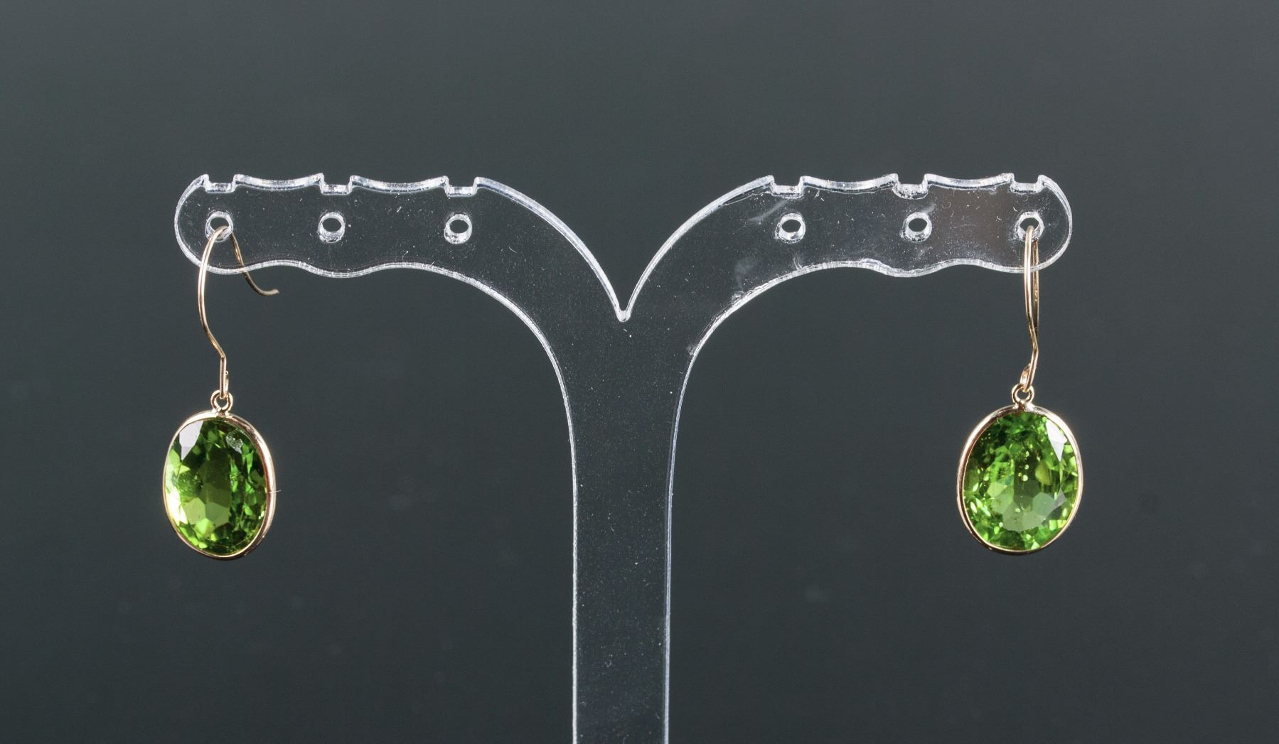 Stamped 14k yellow gold drop earrings; set with 10.4ct oval cut green peridot; certified replacement value $2644; 2.51 grams