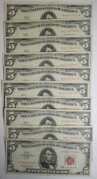 ( 10 ) $5.00 RED SEAL NOTES VF OR BETTER