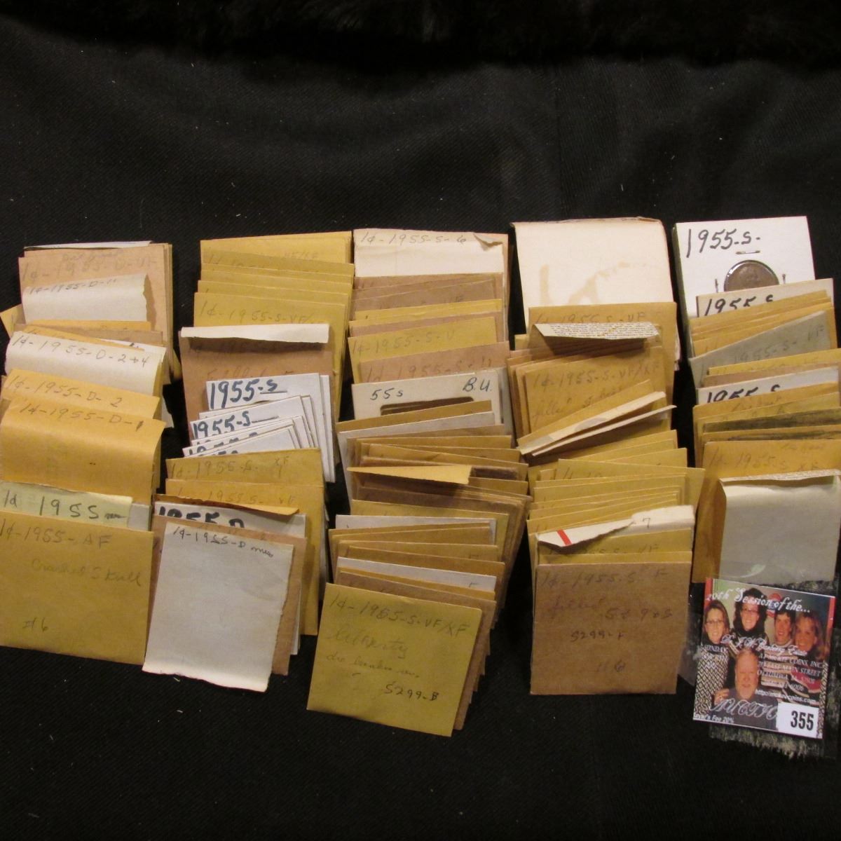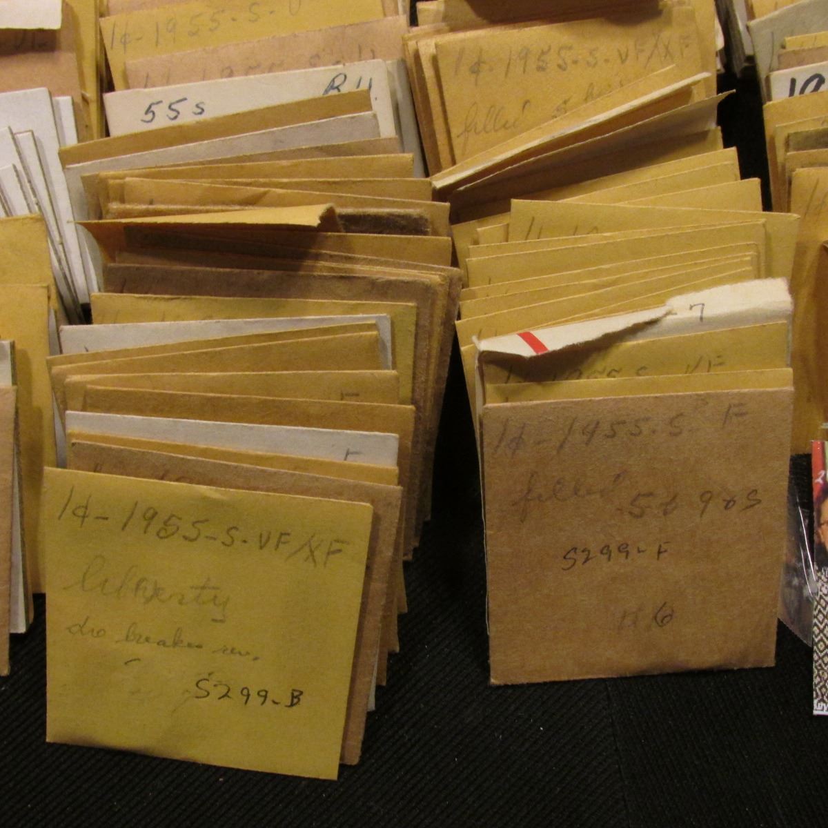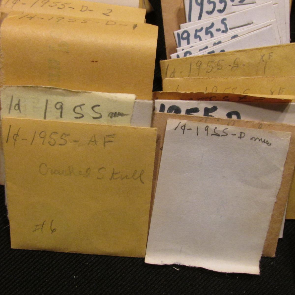 10.5" Coin Box for 2" x 2"s full of U.S. Lincoln Cent Mint errors, including filled dies, die breaks, laminated planchets, all appear to be 1955 P, D, & S Cents.