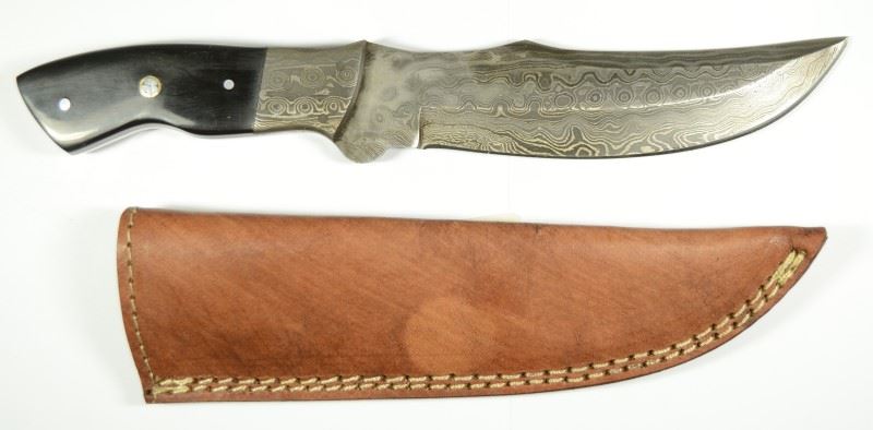 10.5 Inch Rare Rain Drop Pattern Genuine Top Grade Damascus Steel Hunting Knife with a Black Bull Horn Handle. 6.5" upswept blade, 4" handle. Genuine Leather Sheath. EST:$150-$200