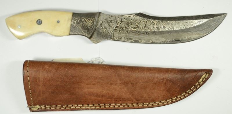 10.5 Inch Rare Rain Drop Patter Genuine Top Grade Damascus Steel Hunting Knife with a Polished Deer Bone Handle. 6.5" Upswept Blade, 4" handle, Genuine Leather Sheath. EST:$150-$200