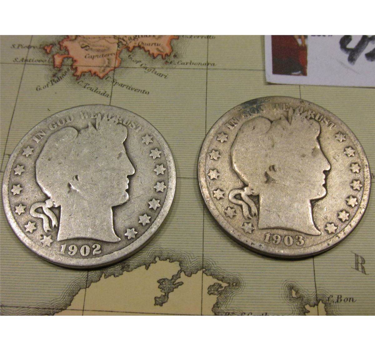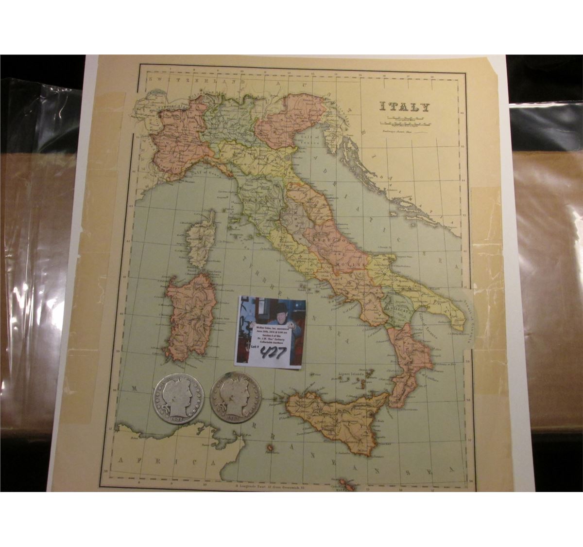 10.5" x 11.5" Map of "Italy" ready for framing; & 1902 P & 1903 O Barber Half Dollars in G-AG.