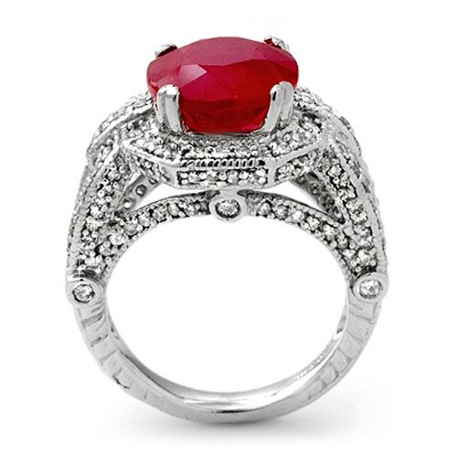 10.50 CTW Ruby & Diamond Ring 14K White Gold ---- Luxury Designer Brand Ring Appraised Retail Price at $12,500 ---- SKU Number US11899 14k White gold Ring Size is 6.75, Ring measuring approx. 9/16" x 7/8" , weighing in total approx. 11.8 grams. Made in the USA and is stamped 14k, Main stone 9 carat total weight containing 1 pieces of Mid-Opaque-Deep Red color with AAA quality Oval shape cut Ruby , Stone #2 1.5 carat total weight containing 134 pieces of H-I color with VS/SI quality Round shape cut