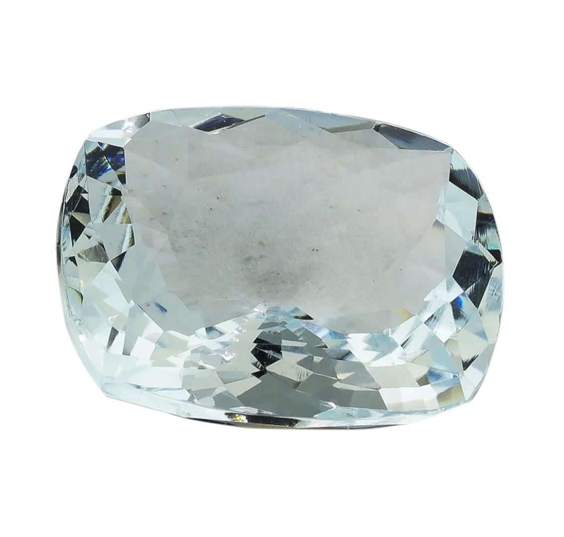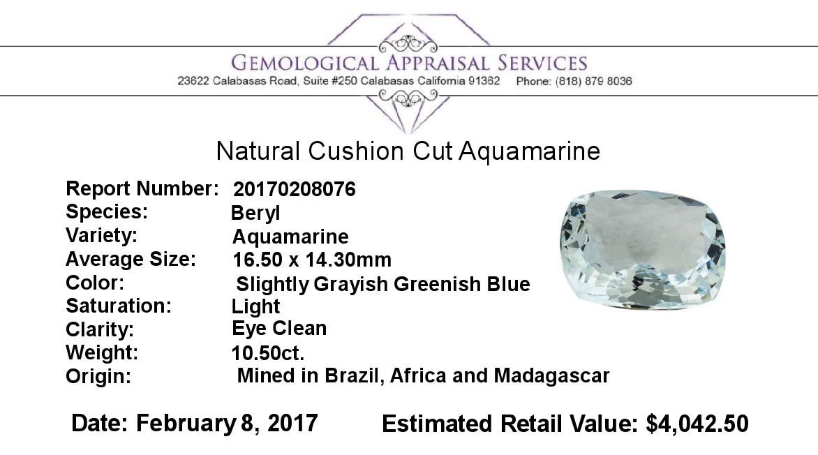 One natural cushion cut aquamarine with an exact weight of 10.50ct., clarity is eye clean, slightly grayish greenish blue, light. Gemological Appraisals Services estimates the retail value at $4042.5 GAS Appraised.