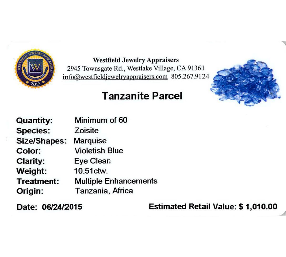 Sixty marquise mixed cut natural tanzanites, measuring 4.00 x 3.00 x 1.95mm, exact total weight 10.51ct., clarity is slightly included, type I, medium dark, very slightly grayish, violetish blue color, (GIA vB 6/3), cut is good. Measurements & the color grade are an average for the group, Color grade is an average for the group, Transmitting light with no distortion, transparent, Naturally occurring internal & external characteristics are present, Indications of multiple laboratory enhancements, including high temperature heat treatment. Westfield Appraised at $1,010.00.