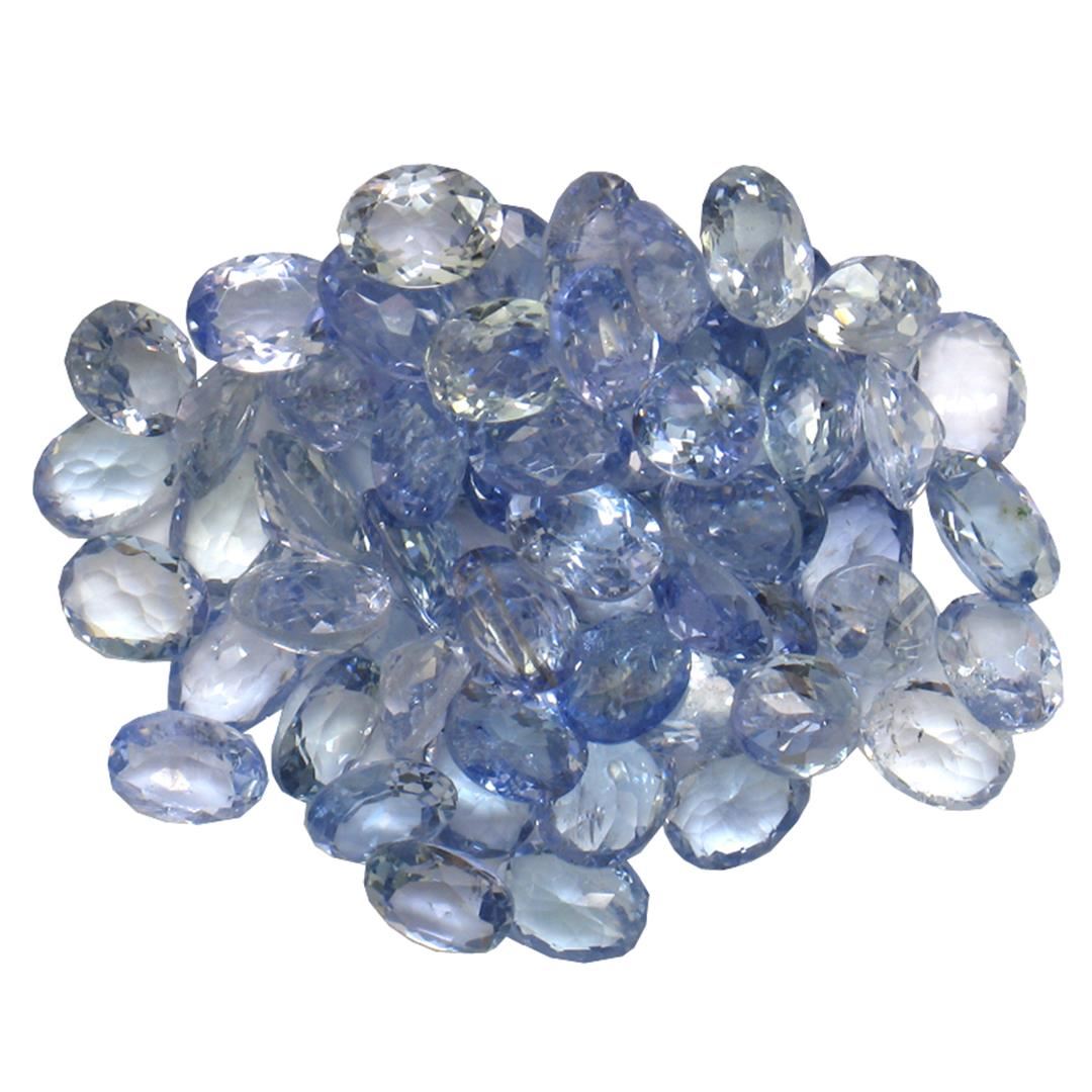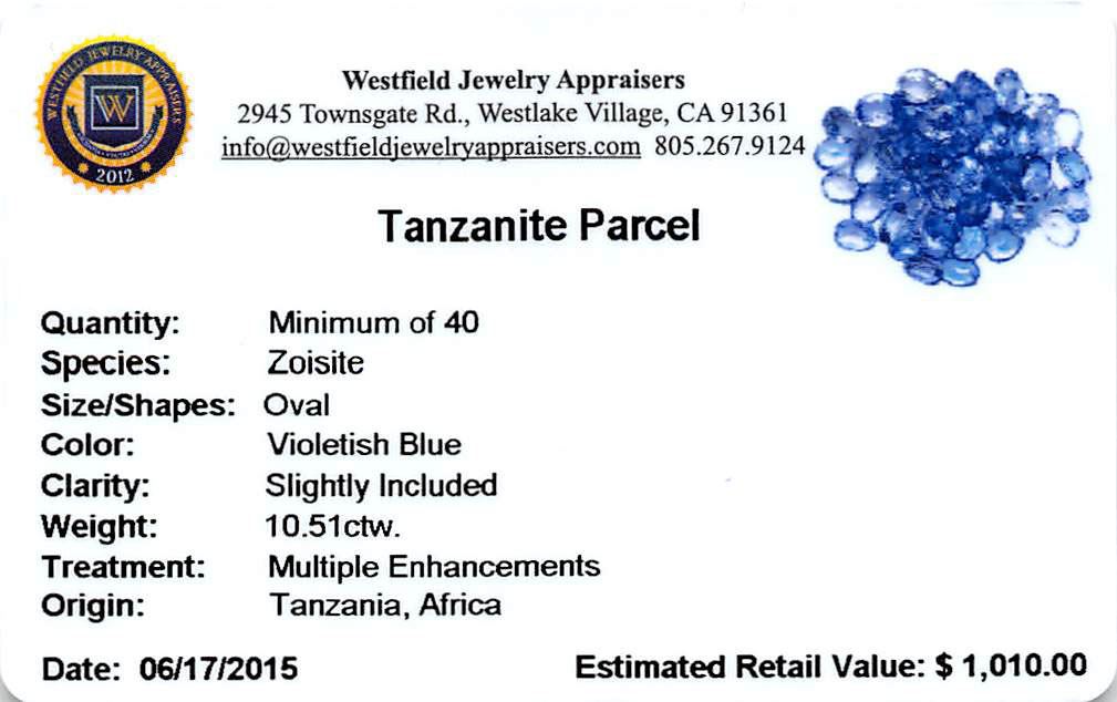 Forty oval mixed cut natural tanzanites exact total weight 10.51ct., clarity is slightly included, type I, medium dark, very slightly grayish, violetish blue color, (GIA vB 6/3), cut is good. Measurements & the color grade are an average for the group, Color grade is an average for the group, Transmitting light with no distortion, transparent, Indications of laboratory high temperature heat treatment. Westfield Appraised at $1,010.00.