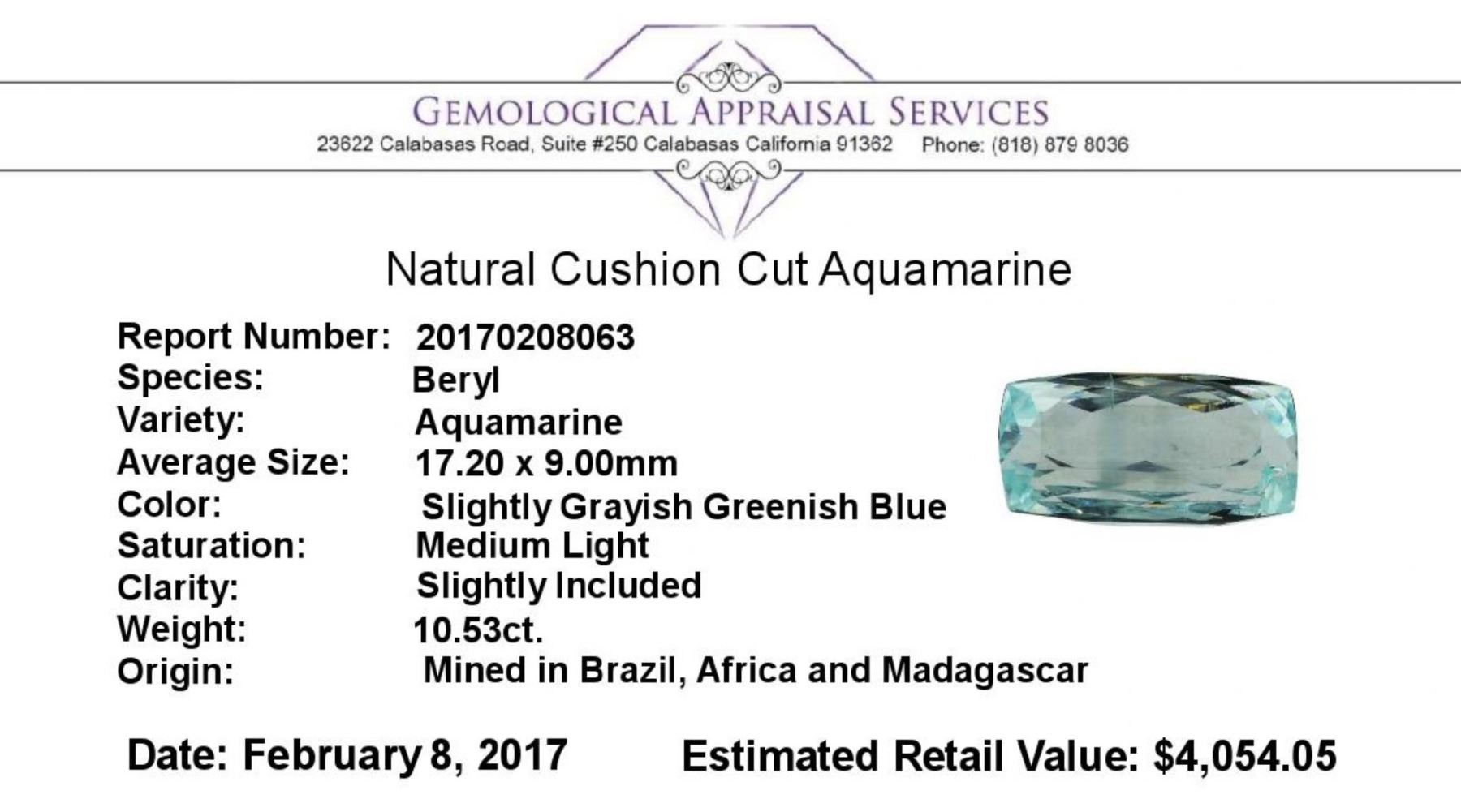 One natural cushion cut aquamarine with an exact weight of 10.53ct., clarity is slightly included, slightly grayish greenish blue, medium light. Gemological Appraisals Services estimates the retail value at $4054.05 GAS Appraised.