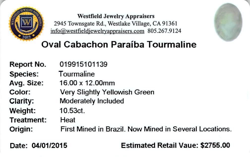 One oval cabochon cut natural Paraiba tourmaline exact weight 10.53ct., clarity is moderately included, cut is good. Westfield Appraised at $2,755.00.