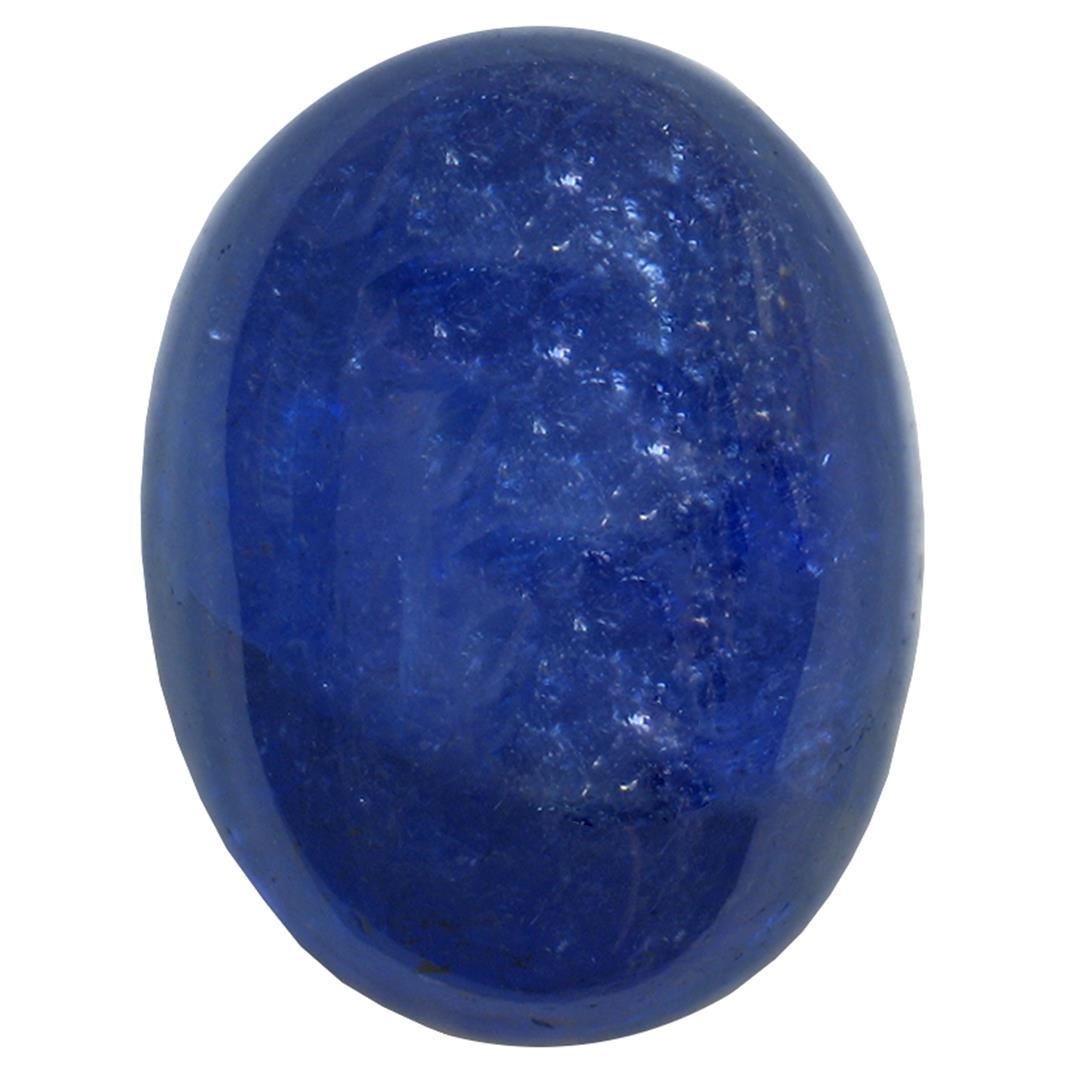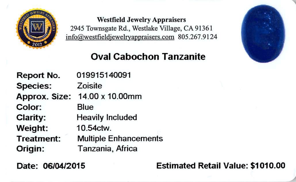 One oval cabochon cut tanzanite, measuring 13.30 x 11.00 x 7.50mm, exact weight 10.54ct., clarity is heavily included, type I, dark, moderately strong, blue color, (GIA B 7/4), cut is good. Transmitting light somewhat diffusely, transparent to translucent. Naturally occurring internal & external characteristics are present. Indications of heat treatment. Westfield Appraised at $1,010.00.