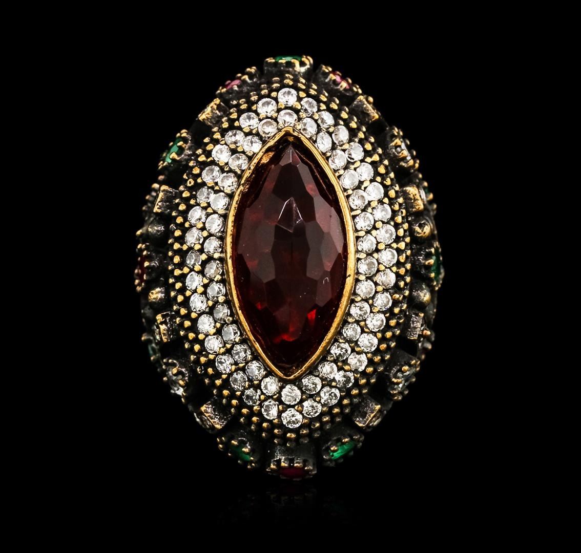 One 10.55ct Red Crystal and Multi Gemstone Ring - 925 SILVER. The featured lab created red crystal is set within tiered lab created cubic zirconia bezels supported by tapering lab created ruby, lab created emerald and lab created cubic zirconia set shoulders, completed by a four and one-half millimeter wide band. Bright and anodized finish. Identified with markings of "925". Condition is new, good workmanship. Containing: One bezel set marquise mixed cut laboratory created red crystal, measuring 19.00 x 9.00 x 5.60mm, approximate weight of 10.55ct., clarity is eye clean, medium dark, very slightly brownish, slightly purplish red color, (GIA slpR 6/3), cut is good. One bezel set oval mixed cut laboratory created ruby, measuring 5.00 x 3.00 x 1.95mm, approximate weight of 0.25ct., clarity is eye clean, type II, medium dark, very slightly brownish, slightly purplish red color, (GIA slpR 6/3), cut is good. Four bezel set round mixed cut laboratory created rubies, measuring 3.10 - 3.00 x 1.98 mm, approximate total weight of 0.60ct., clarity is eye clean, type II, medium dark, very slightly brownish, slightly purplish red color, (GIA slpR 6/3), cut is good. One bezel set oval mixed cut laboratory created emerald, measuring 5.00 x 3.00 x 1.95mm, approximate weight of 0.17ct., clarity is eye clean, type III, medium dark, very slightly grayish, very slightly bluish green color, (GIA vslbG 6/3), cut is good. Six bezel set round mixed cut laboratory created emeralds, measuring 3.10 - 3.00 x 1.98 mm, approximate total weight of 0.60ct., clarity is eye clean, type III, medium dark, very slightly grayish, very slightly bluish green color, (GIA vslbG 6/3), cut is good. Four bezel set round brilliant cut laboratory created cubic zirconias, measuring 3.10 - 3.00 x 1.98 mm, approximate total weight of 0.88ct., clarity is eye clean, colorless, very slightly grayish, white color, (GIA W 0/3), cut is good. One hundred twenty-four bead set round brilliant cut laboratory created cubic zirconias, measuring 1.80 - 1.50 x 1.07 mm, approximate total weight of 4.96ct., clarity is eye clean, colorless, very slightly grayish, white color, (GIA W 0/3), cut is good. Total Weight of Colored Stones 18.01ct. Total Weight of Ring 26.64gm. AIG Appraised at $2,120.00.
