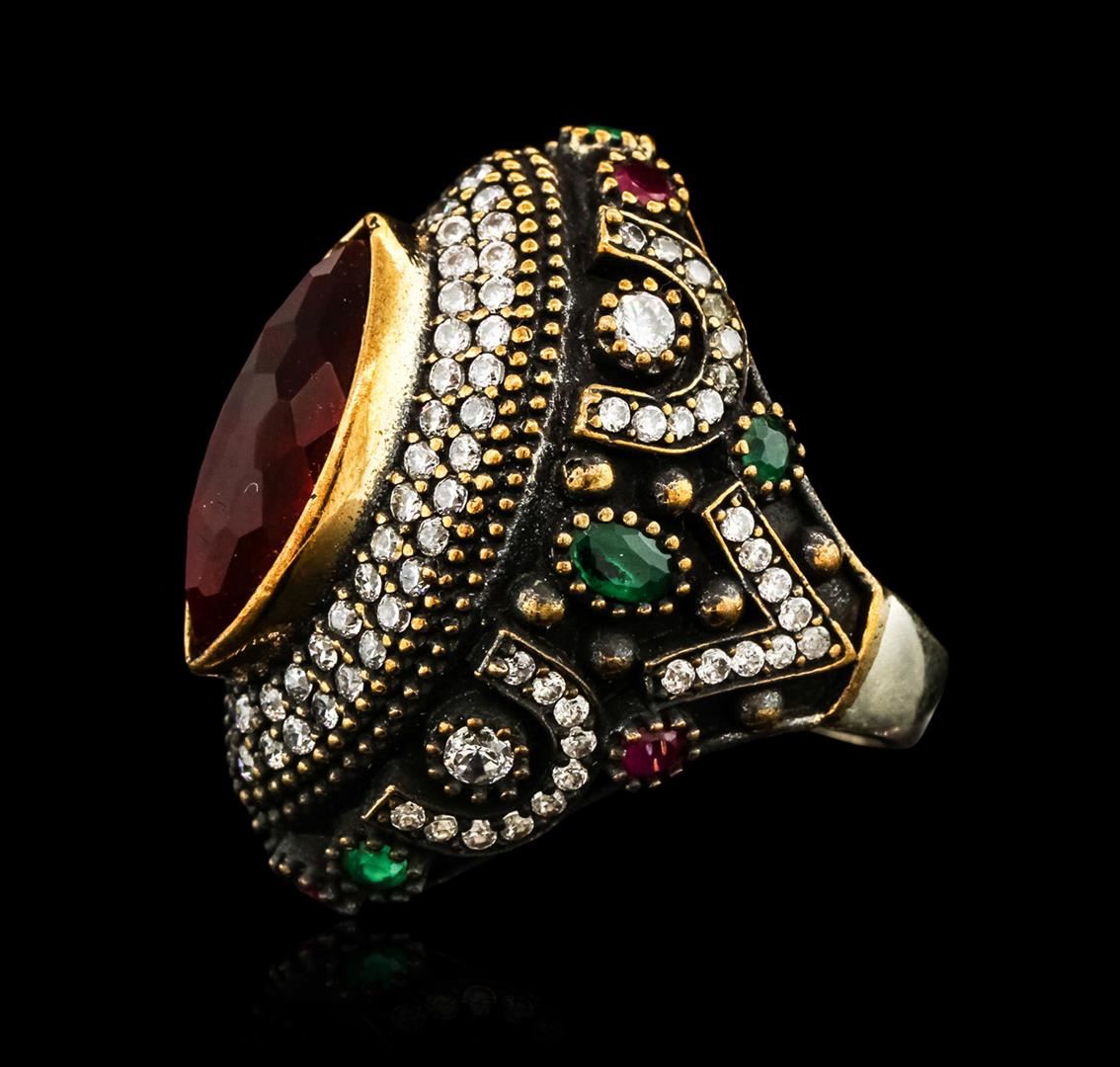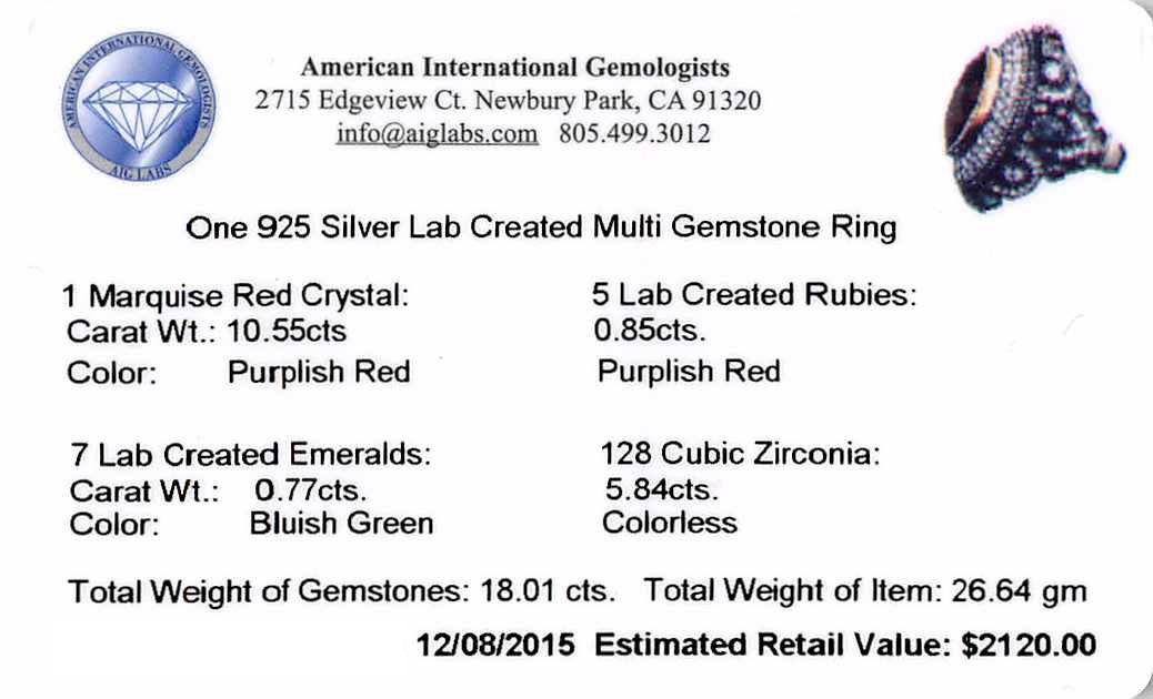 One 10.55ct Red Crystal and Multi Gemstone Ring - 925 SILVER. The featured lab created red crystal is set within tiered lab created cubic zirconia bezels supported by tapering lab created ruby, lab created emerald and lab created cubic zirconia set shoulders, completed by a four and one-half millimeter wide band. Bright and anodized finish. Identified with markings of "925". Condition is new, good workmanship. Containing: One bezel set marquise mixed cut laboratory created red crystal, measuring 19.00 x 9.00 x 5.60mm, approximate weight of 10.55ct., clarity is eye clean, medium dark, very slightly brownish, slightly purplish red color, (GIA slpR 6/3), cut is good. One bezel set oval mixed cut laboratory created ruby, measuring 5.00 x 3.00 x 1.95mm, approximate weight of 0.25ct., clarity is eye clean, type II, medium dark, very slightly brownish, slightly purplish red color, (GIA slpR 6/3), cut is good. Four bezel set round mixed cut laboratory created rubies, measuring 3.10 - 3.00 x 1.98 mm, approximate total weight of 0.60ct., clarity is eye clean, type II, medium dark, very slightly brownish, slightly purplish red color, (GIA slpR 6/3), cut is good. One bezel set oval mixed cut laboratory created emerald, measuring 5.00 x 3.00 x 1.95mm, approximate weight of 0.17ct., clarity is eye clean, type III, medium dark, very slightly grayish, very slightly bluish green color, (GIA vslbG 6/3), cut is good. Six bezel set round mixed cut laboratory created emeralds, measuring 3.10 - 3.00 x 1.98 mm, approximate total weight of 0.60ct., clarity is eye clean, type III, medium dark, very slightly grayish, very slightly bluish green color, (GIA vslbG 6/3), cut is good. Four bezel set round brilliant cut laboratory created cubic zirconias, measuring 3.10 - 3.00 x 1.98 mm, approximate total weight of 0.88ct., clarity is eye clean, colorless, very slightly grayish, white color, (GIA W 0/3), cut is good. One hundred twenty-four bead set round brilliant cut laboratory created cubic zirconias, measuring 1.80 - 1.50 x 1.07 mm, approximate total weight of 4.96ct., clarity is eye clean, colorless, very slightly grayish, white color, (GIA W 0/3), cut is good. Total Weight of Colored Stones 18.01ct. Total Weight of Ring 26.64gm. AIG Appraised at $2,120.00.
