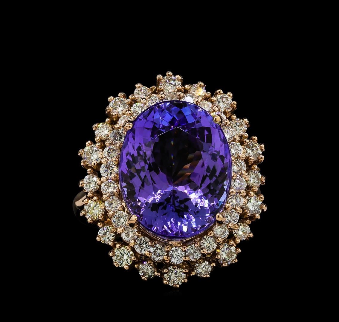 One electronically tested 14KT rose gold lady's cast fashion ring with a double basket halo with a bright polish finish. The featured lady's ring has a shank measuring 2.69 millimeters wide. Identified with markings of 'K14'. Condition is new, good workmanship. Containing: One prong set oval modified brilliant cut natural tanzanite, measuring 14.53 x 11.62 x 8.71mm, (depth est.) 2%. bulge factor, approximate weight of 10.55ct., clarity is eye clean, medium, moderately strong, bluish violet color, (GIA bV 5/4), cut is very good. Transmitting light with no distortion, transparent. Colored gemstones are presumed to have been subjected to commonly used enhancement processes. Graded in the setting. Ten prong set round brilliant cut diamonds, measuring 2.30 - 2.20 x 1.37mm (depth est.) approximate total weight of 10 Stones = 0.42ct. Graded in the setting. Clarity VS-2 to SI-2. Color: H - I Cut Good Thirty-Six prong set round brilliant cut diamonds, measuring 1.90 - 1.70 x 1.12mm (depth est.) approximate total weight of 36 Stones = 0.79ct. Graded in the setting. Clarity SI-1 to I-1. Color: H - I Cut Good. Total Weight of Colored Stones 10.55ct.. Total Weight of Diamonds 1.21ct.. Total Weight of Ring 9.10gm. GAS Appraised at $18,425.00.