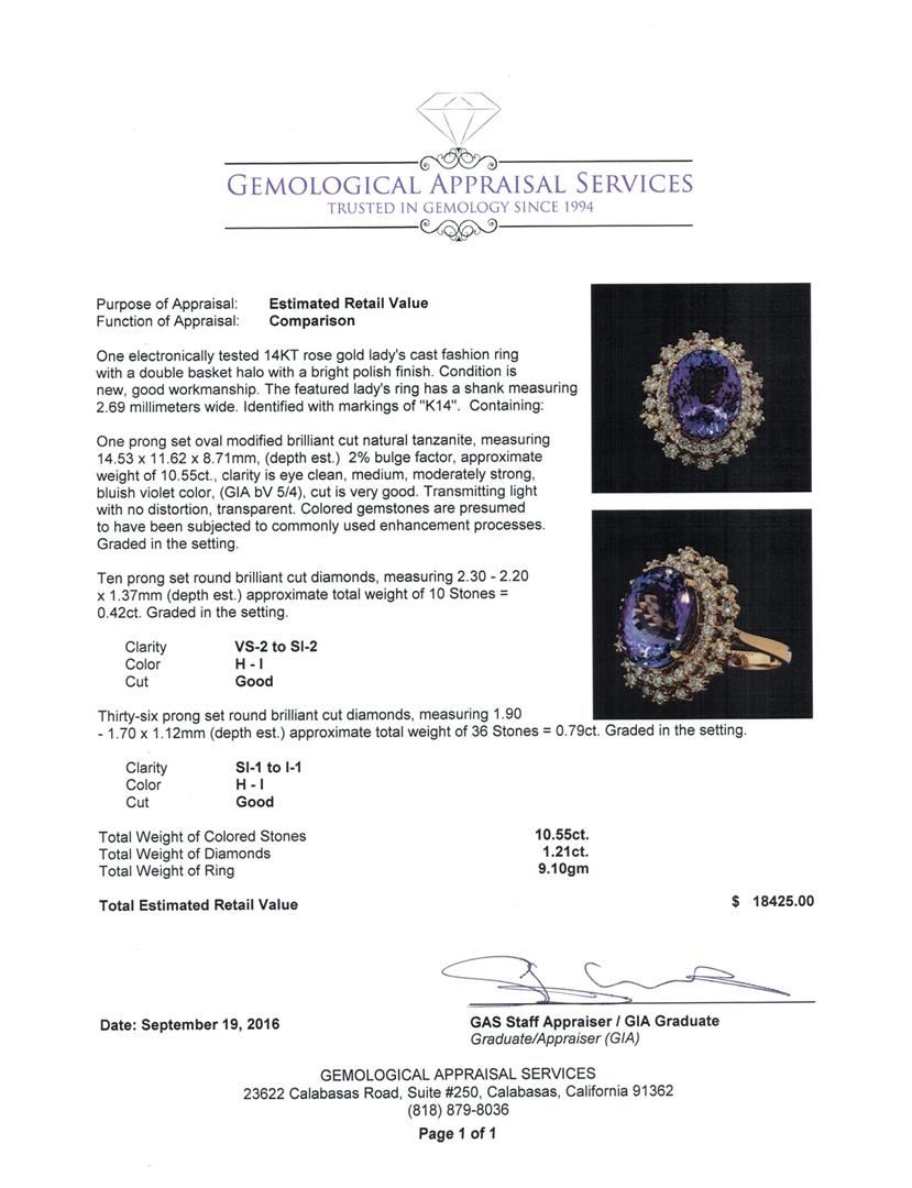 One electronically tested 14KT rose gold lady's cast fashion ring with a double basket halo with a bright polish finish. The featured lady's ring has a shank measuring 2.69 millimeters wide. Identified with markings of 'K14'. Condition is new, good workmanship. Containing: One prong set oval modified brilliant cut natural tanzanite, measuring 14.53 x 11.62 x 8.71mm, (depth est.) 2%. bulge factor, approximate weight of 10.55ct., clarity is eye clean, medium, moderately strong, bluish violet color, (GIA bV 5/4), cut is very good. Transmitting light with no distortion, transparent. Colored gemstones are presumed to have been subjected to commonly used enhancement processes. Graded in the setting. Ten prong set round brilliant cut diamonds, measuring 2.30 - 2.20 x 1.37mm (depth est.) approximate total weight of 10 Stones = 0.42ct. Graded in the setting. Clarity VS-2 to SI-2. Color: H - I Cut Good Thirty-Six prong set round brilliant cut diamonds, measuring 1.90 - 1.70 x 1.12mm (depth est.) approximate total weight of 36 Stones = 0.79ct. Graded in the setting. Clarity SI-1 to I-1. Color: H - I Cut Good. Total Weight of Colored Stones 10.55ct.. Total Weight of Diamonds 1.21ct.. Total Weight of Ring 9.10gm. GAS Appraised at $18,425.00.
