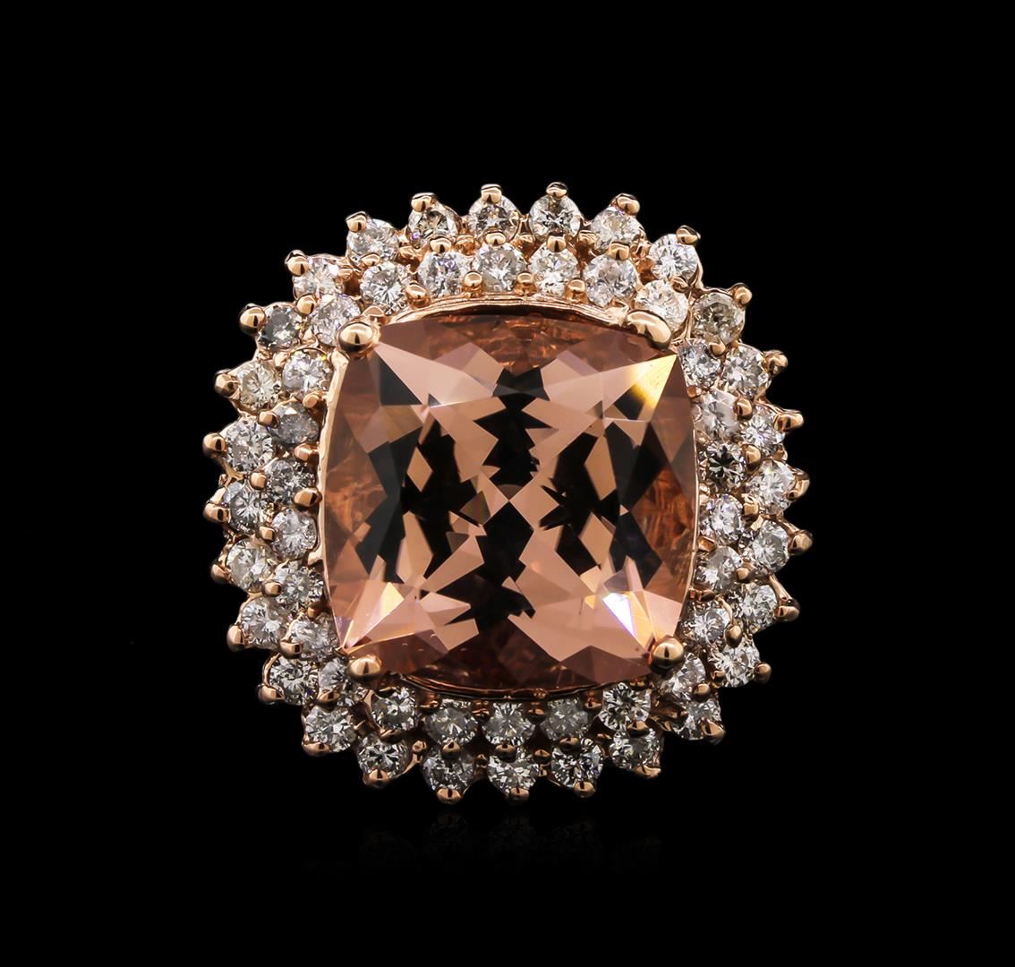 One electronically tested 14KT rose gold lady's cast fashion ring with a double cushion halo with a bright polish finish. The featured lady's ring has a shank measuring 2.00 millimeters wide. Identified with markings of "14K". Condition is new, good workmanship. Containing: One prong set square cushion modified brilliant cut natural morganite, measuring 14.05 x 14.04 x 9.15mm, approximate weight of 10.55ct., clarity is eye clean, type I, light, very slightly brownish, reddish orange color, (GIA rO 3/3), cut is good. Transmitting light with no distortion, transparent. Colored gemstones are presumed to have been subjected to commonly used enhancement processes. Graded in the setting. Fifty-Four prong set round brilliant cut diamonds, measuring 2.10 - 2.00 x 1.33mm (depth est.) approximate total weight of 54 Stones = 1.84ct. Graded in the setting. Clarity: SI-1 to I-1. Color: H - J. Cut Good. Total Weight of Colored Stones 10.55ct. Total Weight of Diamonds 1.84ct. Total Weight of Ring 14.50gm. GAS Appraised at $8,940.00.